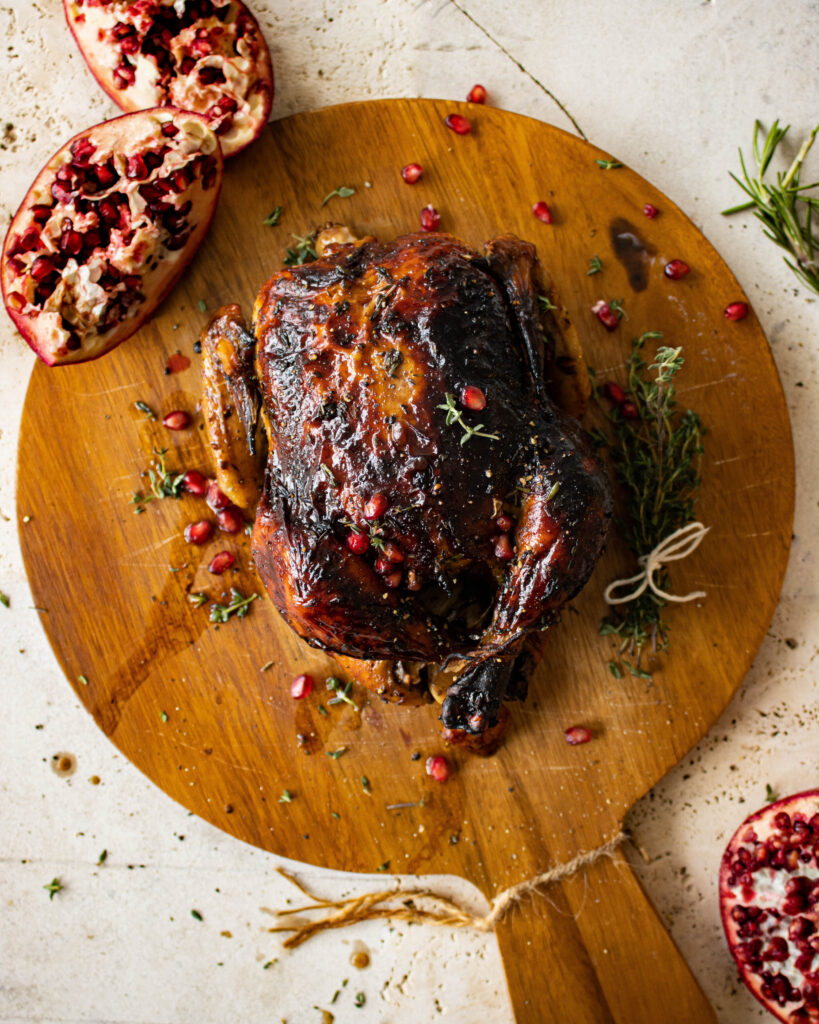 Nothing pleases a crowd like a classic roast chicken. To make it feel extra special, you’ll make a marinade of olive oil, pomegranate molasses, pomegranate juice, honey, balsamic, lemon, garlic, and pomegranate seeds. Allow the chicken to sit in that marinade for at least 30 minutes (or overnight), and transfer to a roasting dish. It will cook for about an hour and a half and make your home smell delicious in the process.