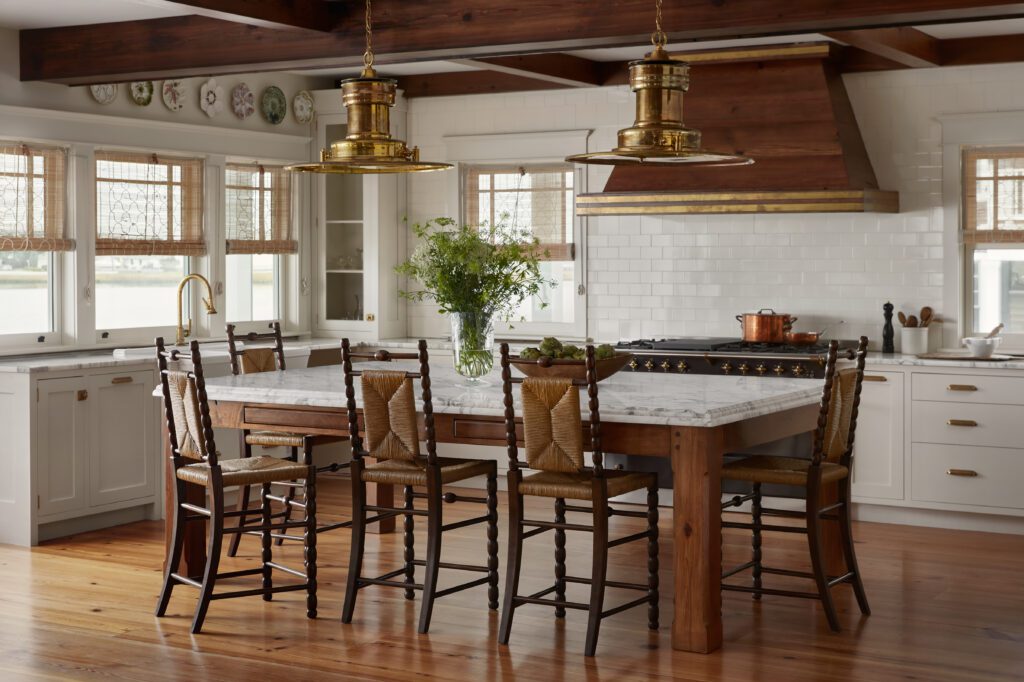 In the kitchen, every detail was designed to blend function with heritage. A La Canche range in Chocolate with unlacquered brass knobs anchors the space, flanked by handmade Heritage subway tiles and a custom island topped in Carrera marble. The island, a client favorite, doubles as both prep station and dinner table — a setup perfect for cooking while entertaining. Collected oyster plates and vintage counter stools with rush seats add character.