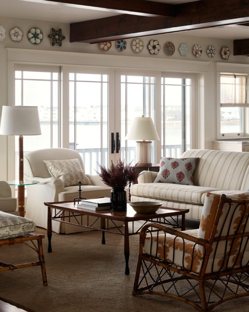 In the family room, comfort meets playfulness: an English-arm sofa in ticking stripe, chairs reupholstered in a rich palm motif, and vintage finds sourced from Chairish — including oyster plates and a quirky 70s floor lamp. A custom coffee table, inspired by ancient Egyptian drawings, adds a one-of-a-kind note.