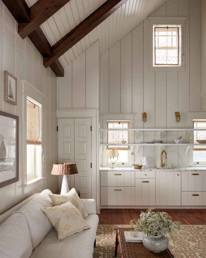 The guest house (or “boat house”) continues the nautical story. Painted completely in School House White, it layers nickel gap cabinetry and v-groove millwork for a light, seaside shell. Stark’s hand-knotted rug, a bamboo coffee table from 1stDibs, and shelves running across the windows infuse the space with charm and age, as though it had always been there.
