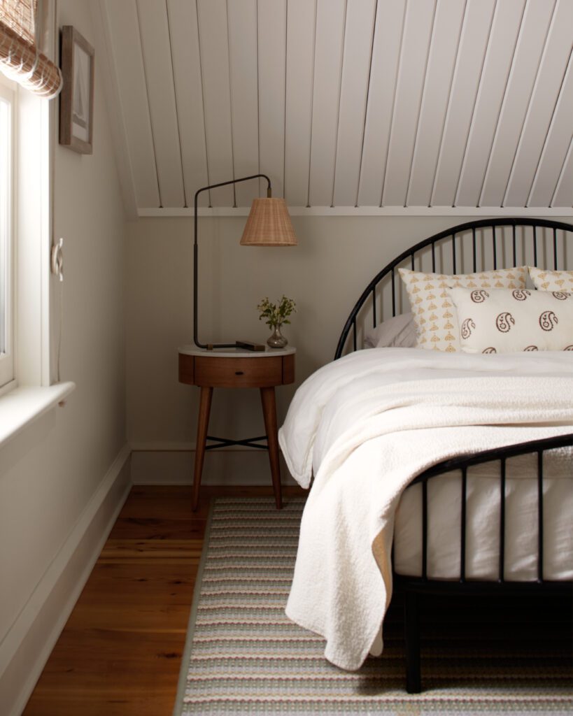 Built in 2021, the Cape Cod structure was designed with old boathouses in mind. Board-and-batten, v-groove, and exposed beams were layered throughout, paired with Farrow & Ball’s School House White — a paint that feels aged and softened, instantly grounding the house with patina. “That canvas allowed us to build a vintage palette,” says Erica.