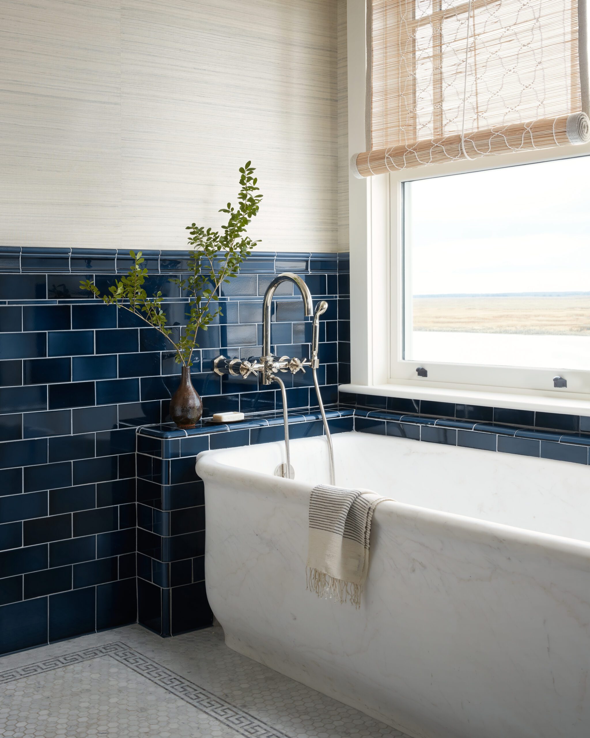 Bedrooms lean into nostalgia: one son’s room has an iron bed and textiles that feel like “a knitted sweater passed down from grandma,” while the primary suite features a bobbin headboard, vintage kantha throw, and a Paris-sourced painting. The primary bath, dressed in deep blue Heritage tile and Carrera marble, offers serene views of the bay.