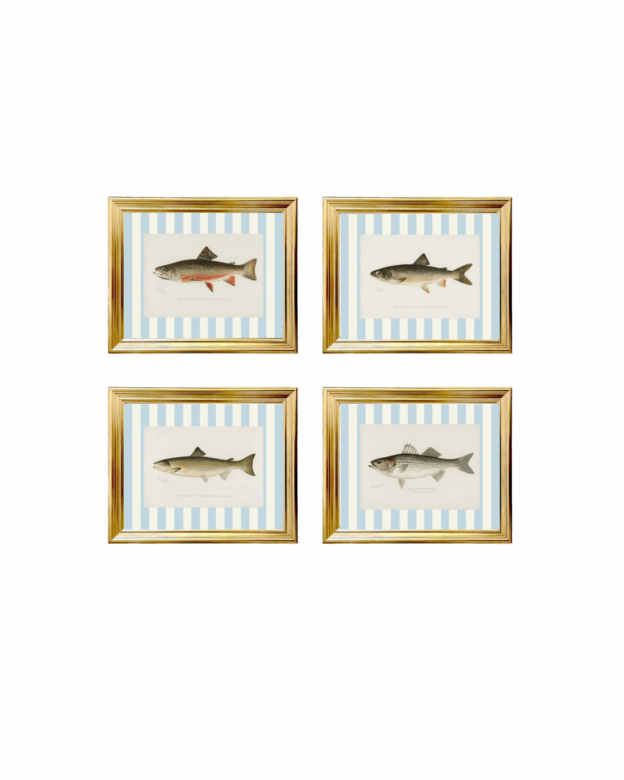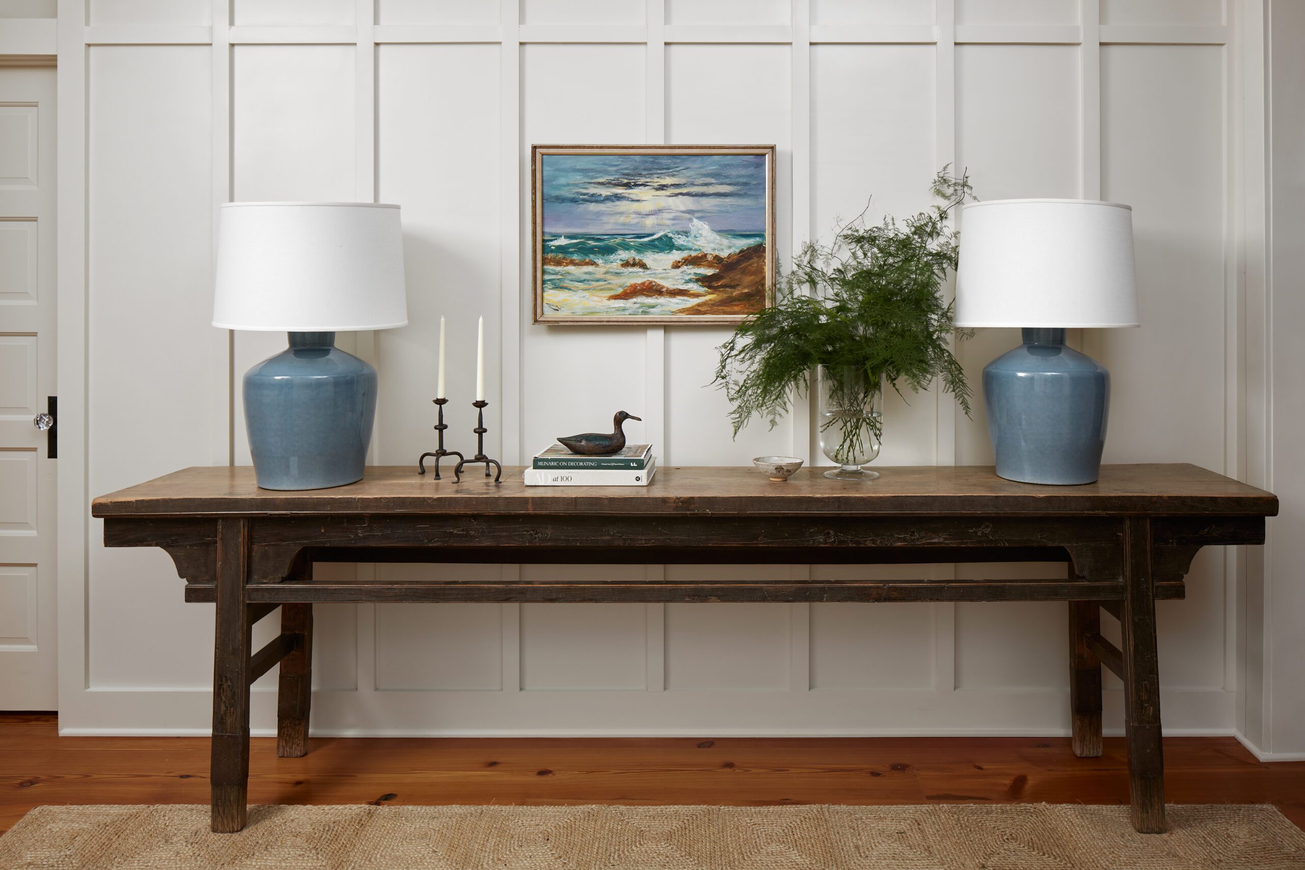 Climbing the stairwell, board-and-batten millwork frames a gallery of the homeowner’s vintage fish prints, while a Stark runner striped in blue and red adds punch. The second-floor landing continues the collected theme with a reclaimed wood console, oversized blue lamps, and antique decoys.