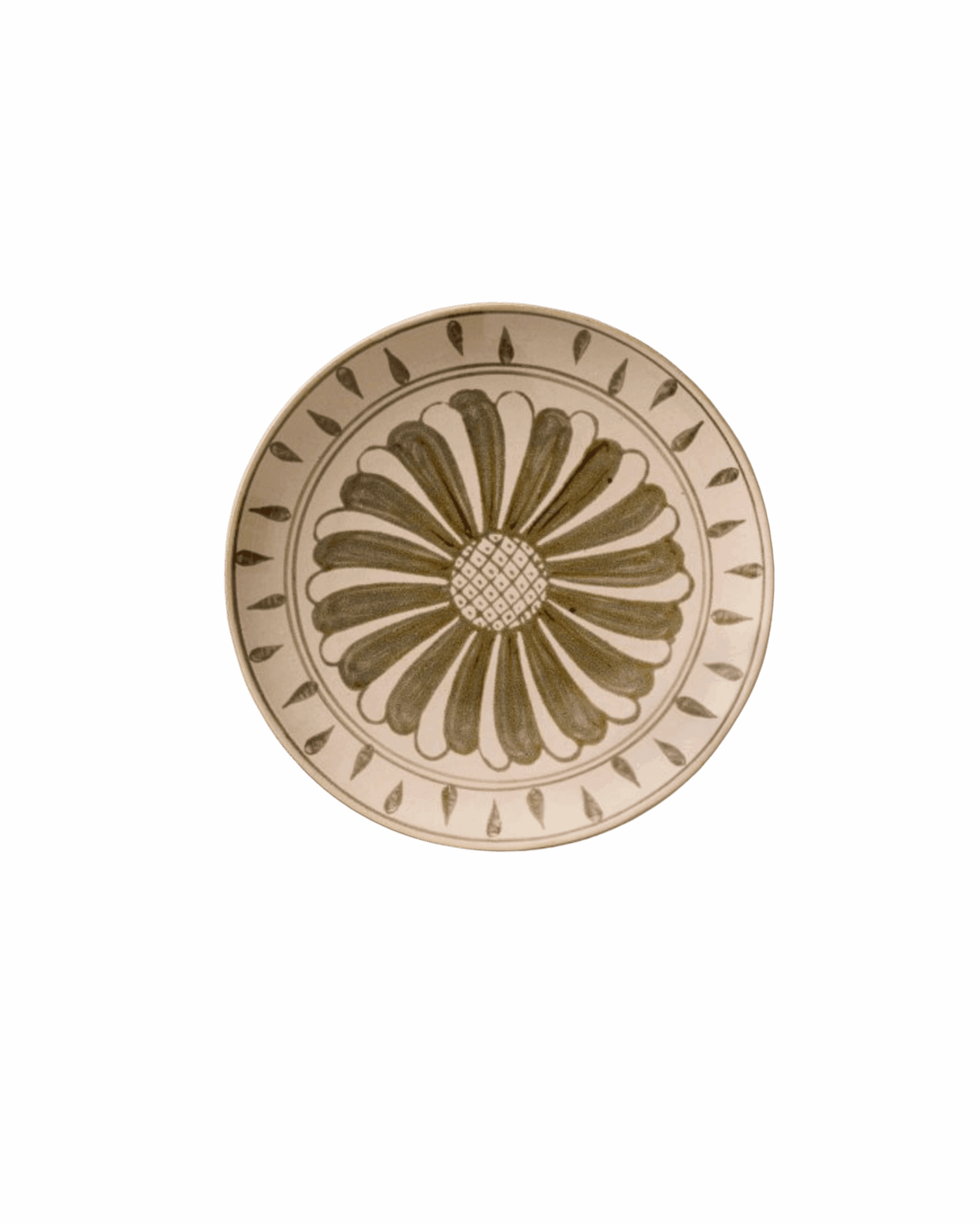 In the family room, comfort meets playfulness: an English-arm sofa in ticking stripe, chairs reupholstered in a rich palm motif, and vintage finds sourced from Chairish — including oyster plates and a quirky 70s floor lamp. A custom coffee table, inspired by ancient Egyptian drawings, adds a one-of-a-kind note.