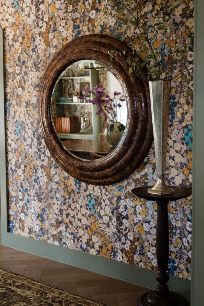 What started as a dark, moody space designed for formal entertaining needed to evolve into something lighter and more playful – especially after welcoming our daughter, Kamryn. House of Hackney’s Hollyhocks wallpaper brought the perfect balance of sophistication and whimsy, and the transformation has made it Kam’s favorite room in the house.