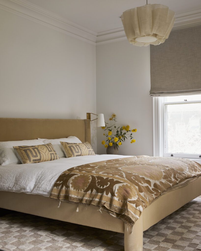 In the new principal suite, tranquility reigns. Soft white walls (Benjamin Moore Simply White), sculptural lighting from Pinch London, and checkerboard wool rug ground the space in quiet luxury. A vintage Suzani textile, custom nightstands, and layered linens round out the look.