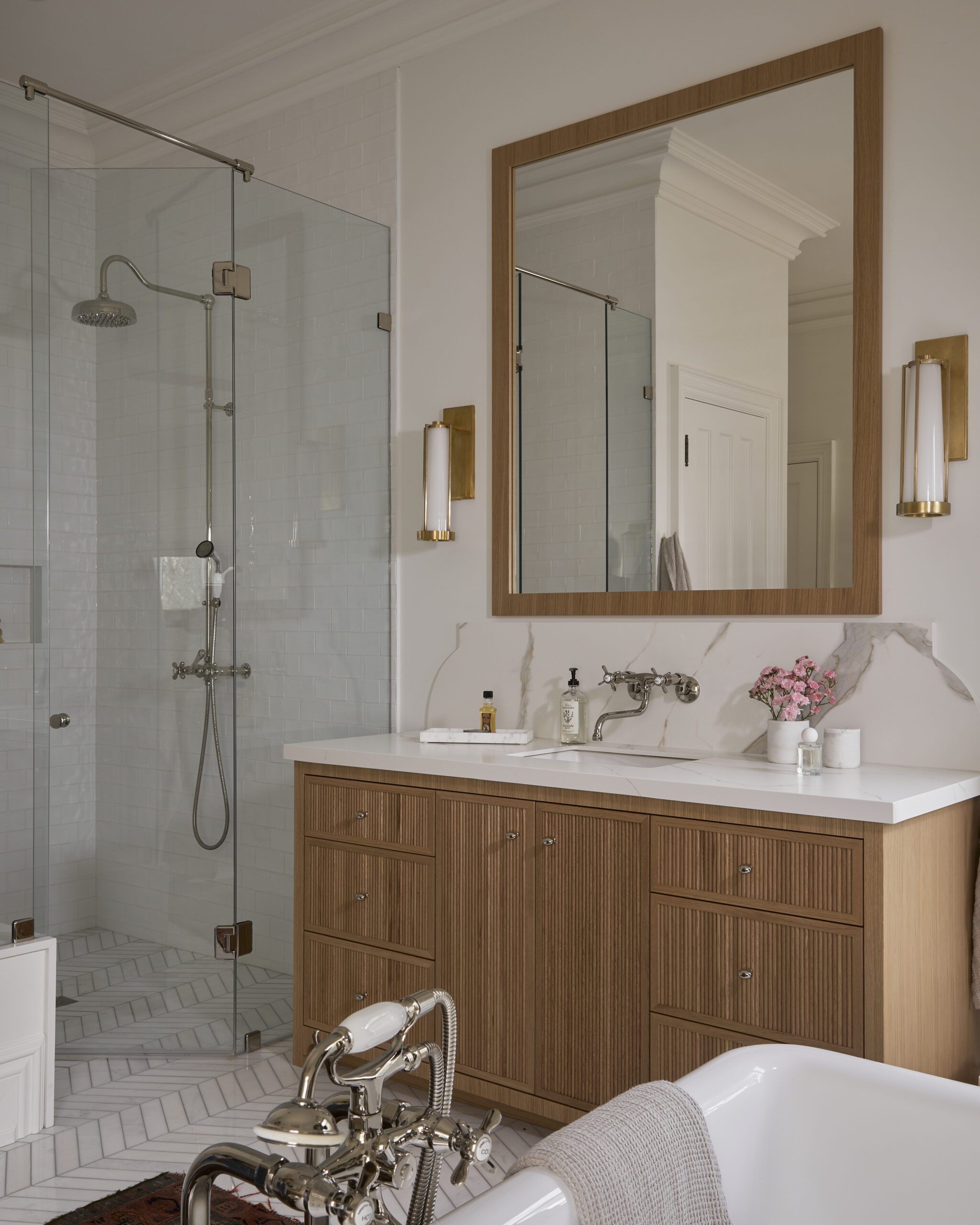 The ensuite bath feels like a retreat: polished brass Visual Comfort sconces, marble mosaic flooring, and a clawfoot tub fitted with a vintage-style Kingston Brass filler. Every inch feels intentional, rooted in a classic aesthetic but executed with a fresh hand.