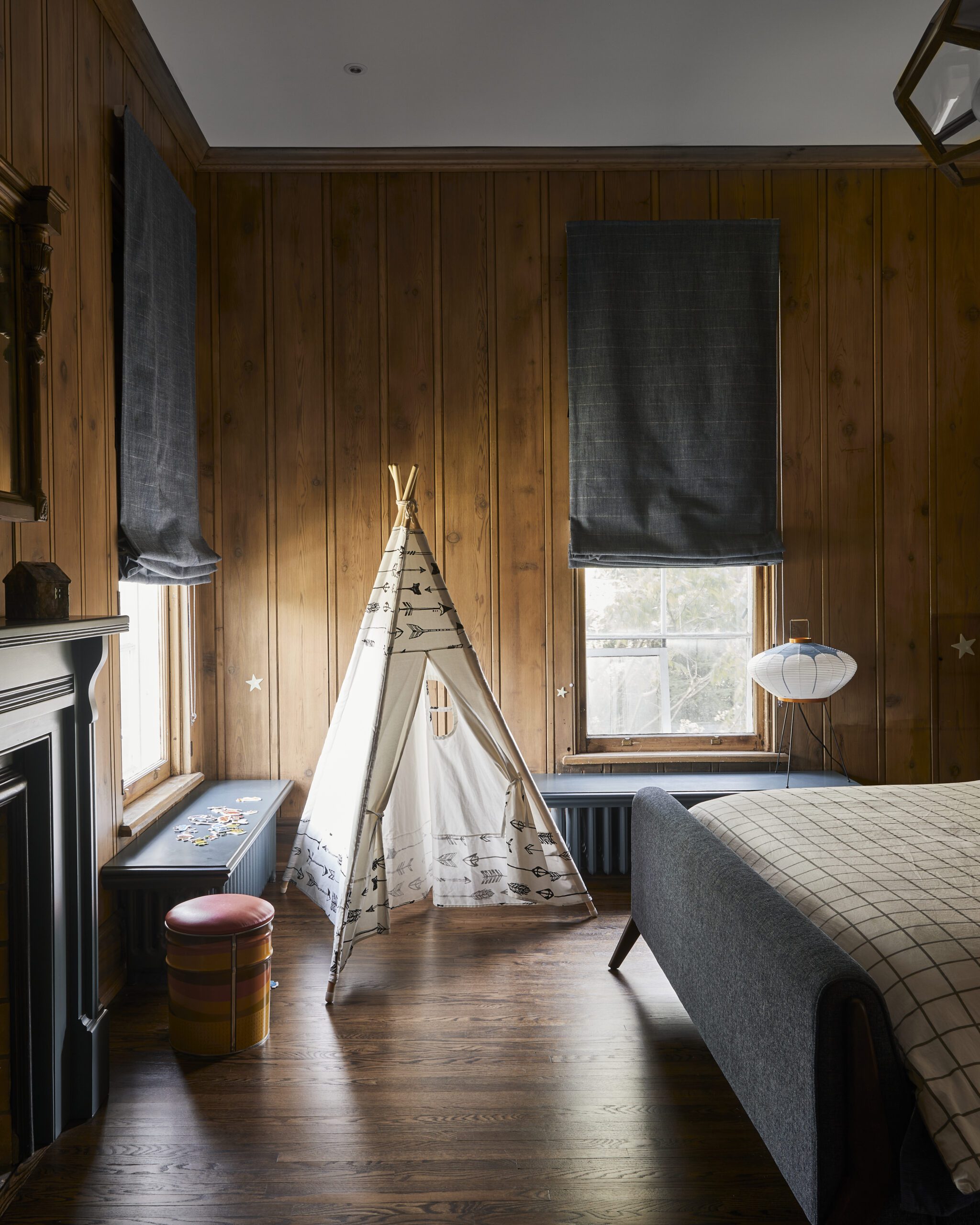 The playful powder room features Common Room’s Lioness & Palms wallpaper, set against a backdrop of high-gloss Benjamin Moore Bold Blue. Upstairs, the children’s bedrooms are filled with soft textures, vintage lighting, and whimsical touches like a teepee and Noguchi lamp.