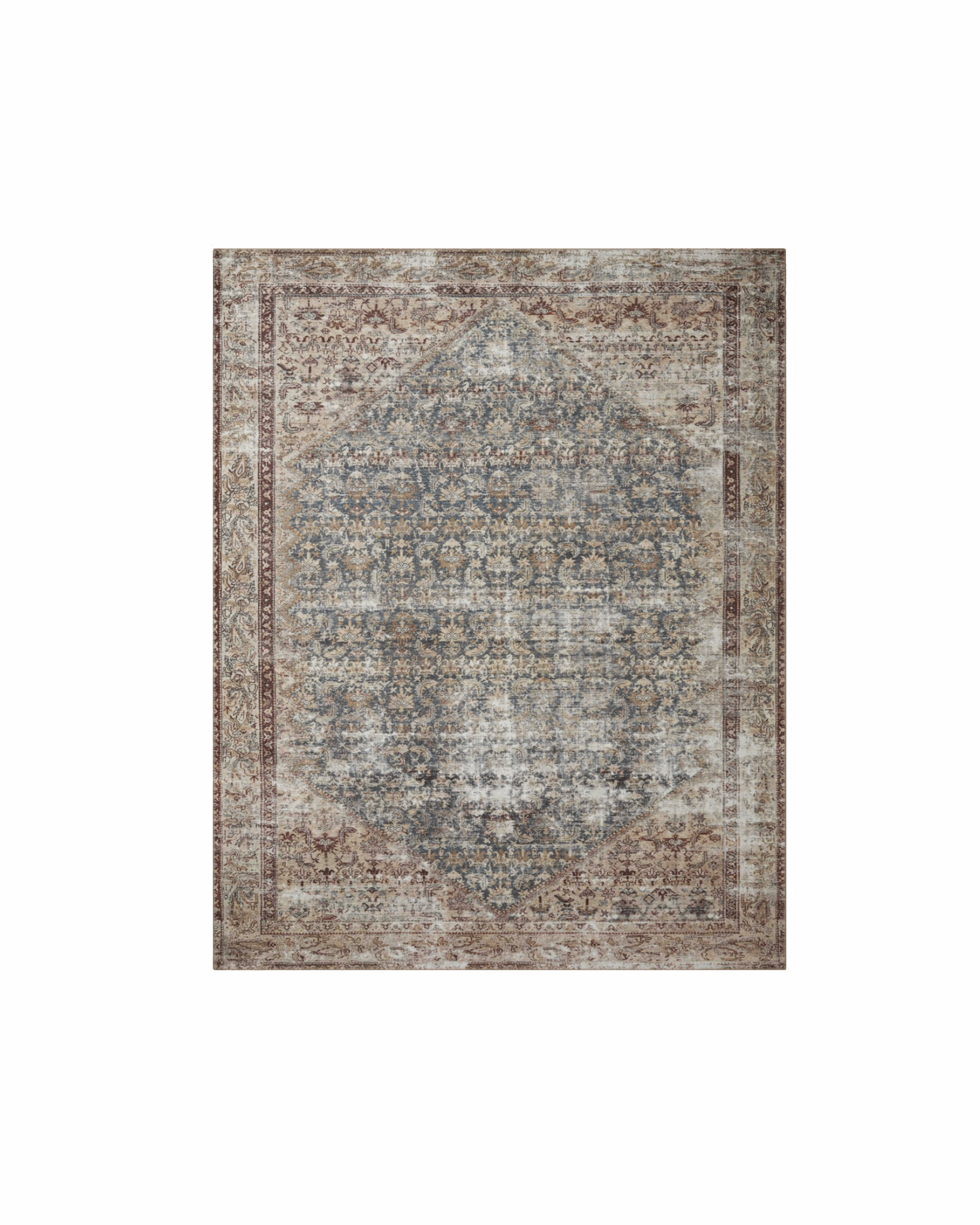The material palette is rich and tactile: Saltillo ceramic tiles for the backsplash, polished nickel hardware from Top Knobs and Emtek, and a vintage Moroccan runner underfoot. Above the island, a Suzanne Kasler pendant from Visual Comfort offers a modern counterpoint.