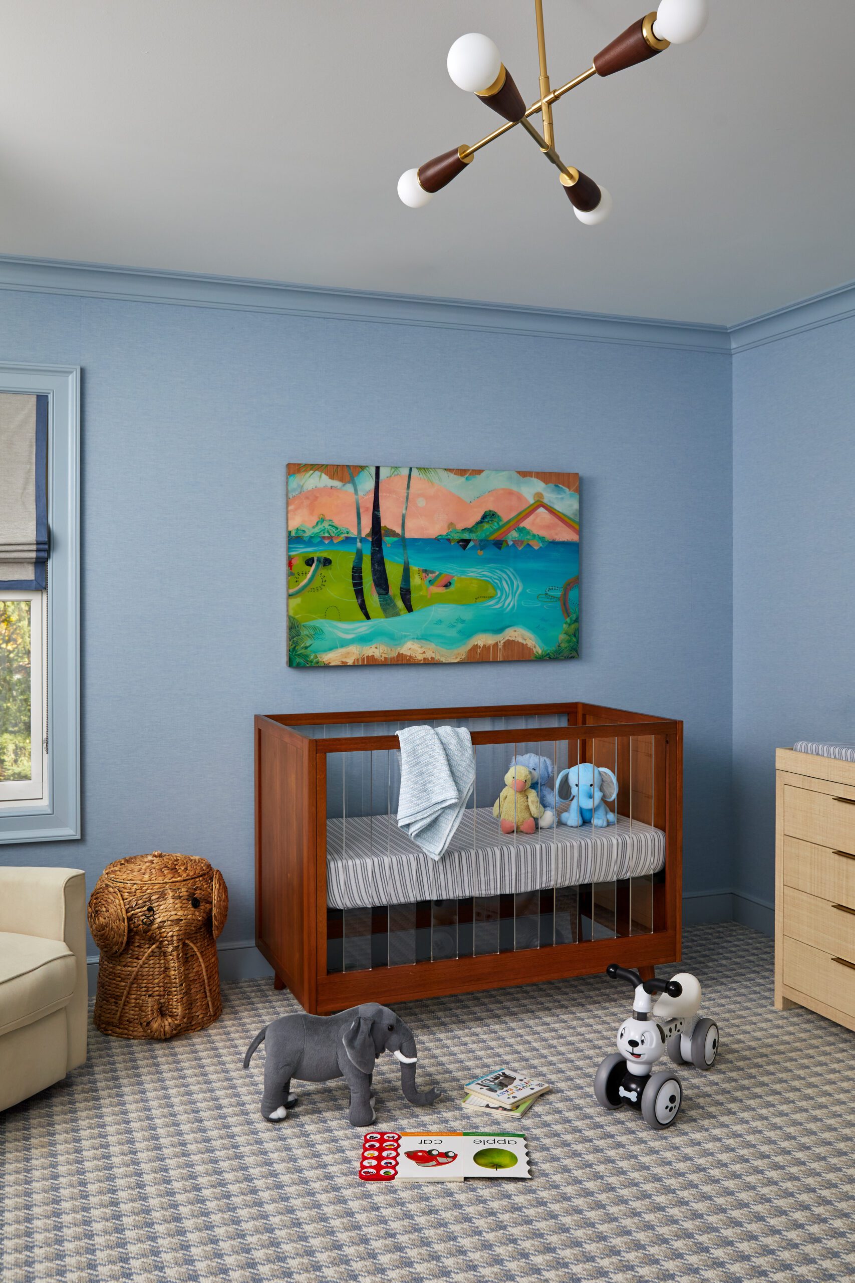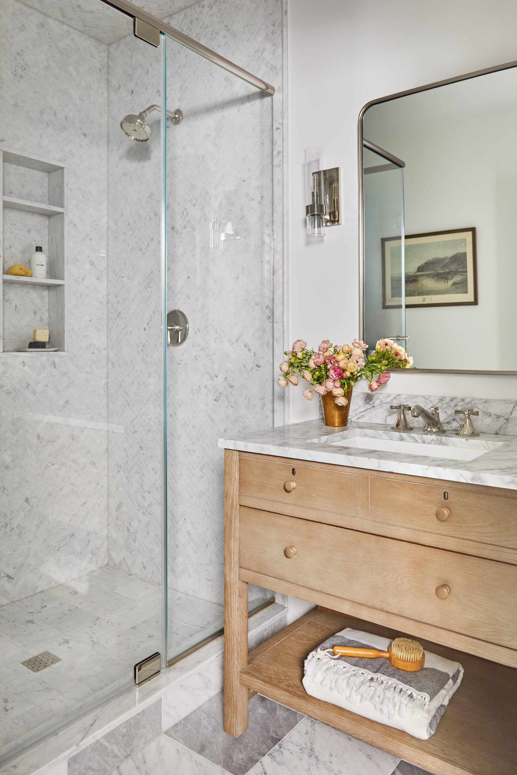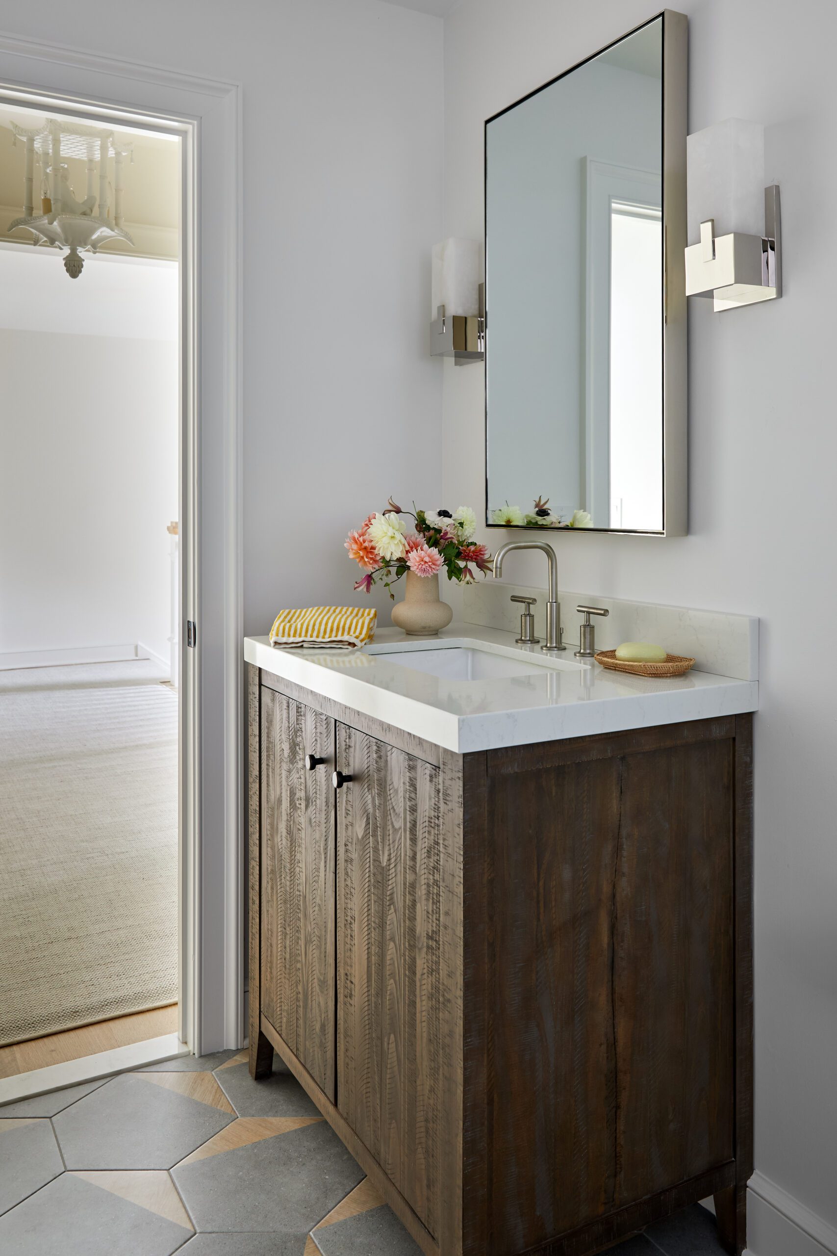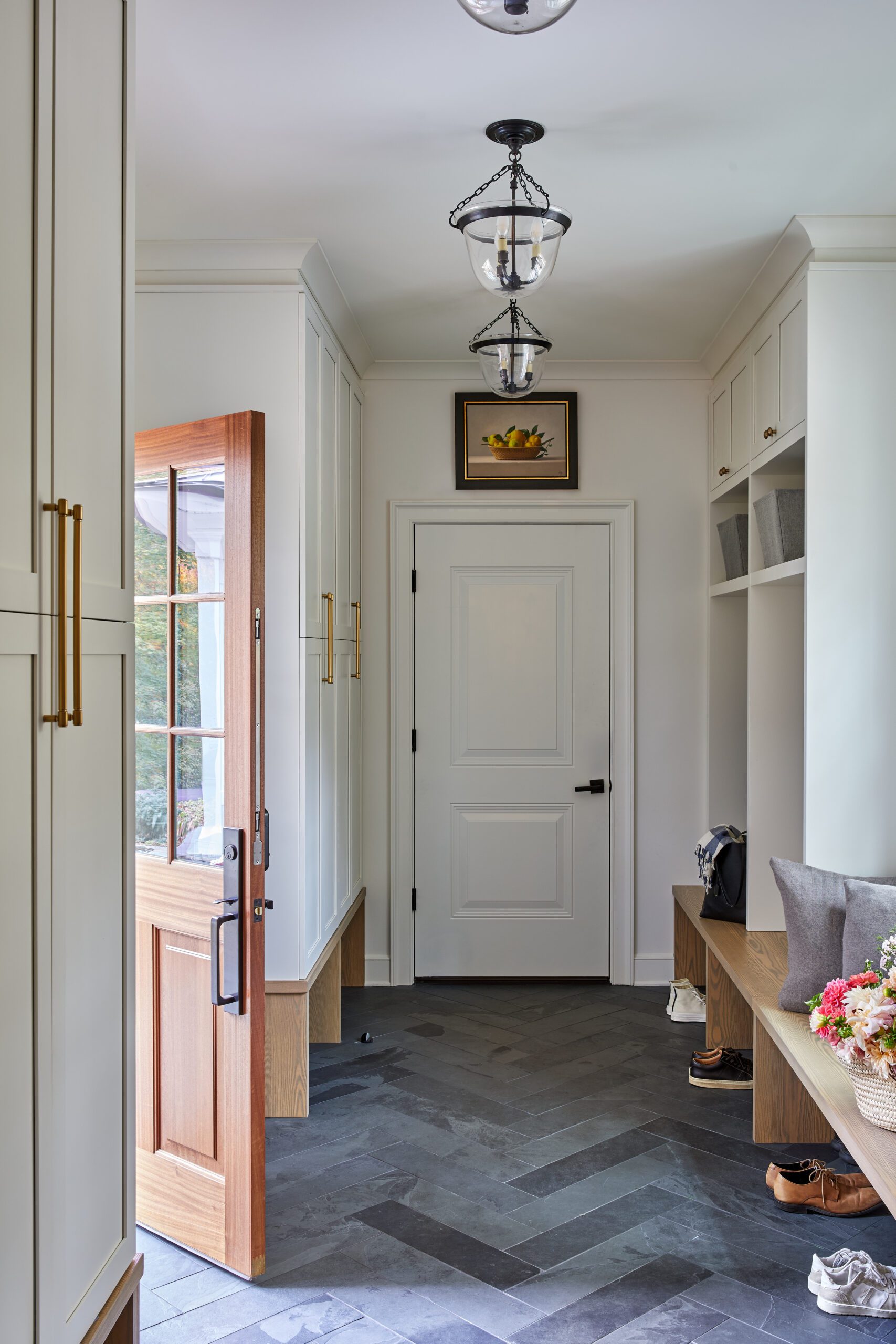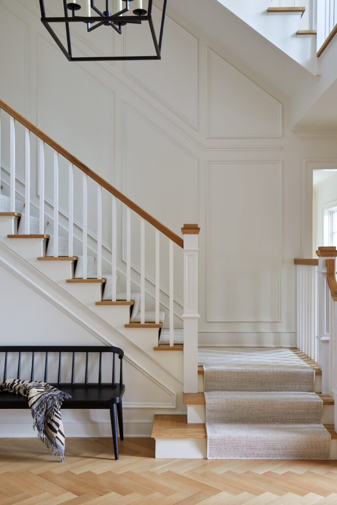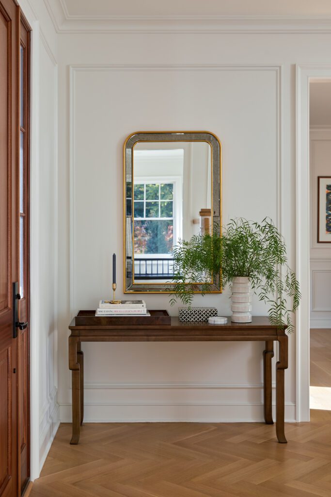 The entrance sets the tone for the home’s material palette with warm wood herringbone floors, timeless wall-treatment details, and a carefully curated drop-zone for out-the-door essentials. KKB used Benjamin Moore’s White Dove on the walls throughout the space for a warm-neutral that easily transitions from room to room.