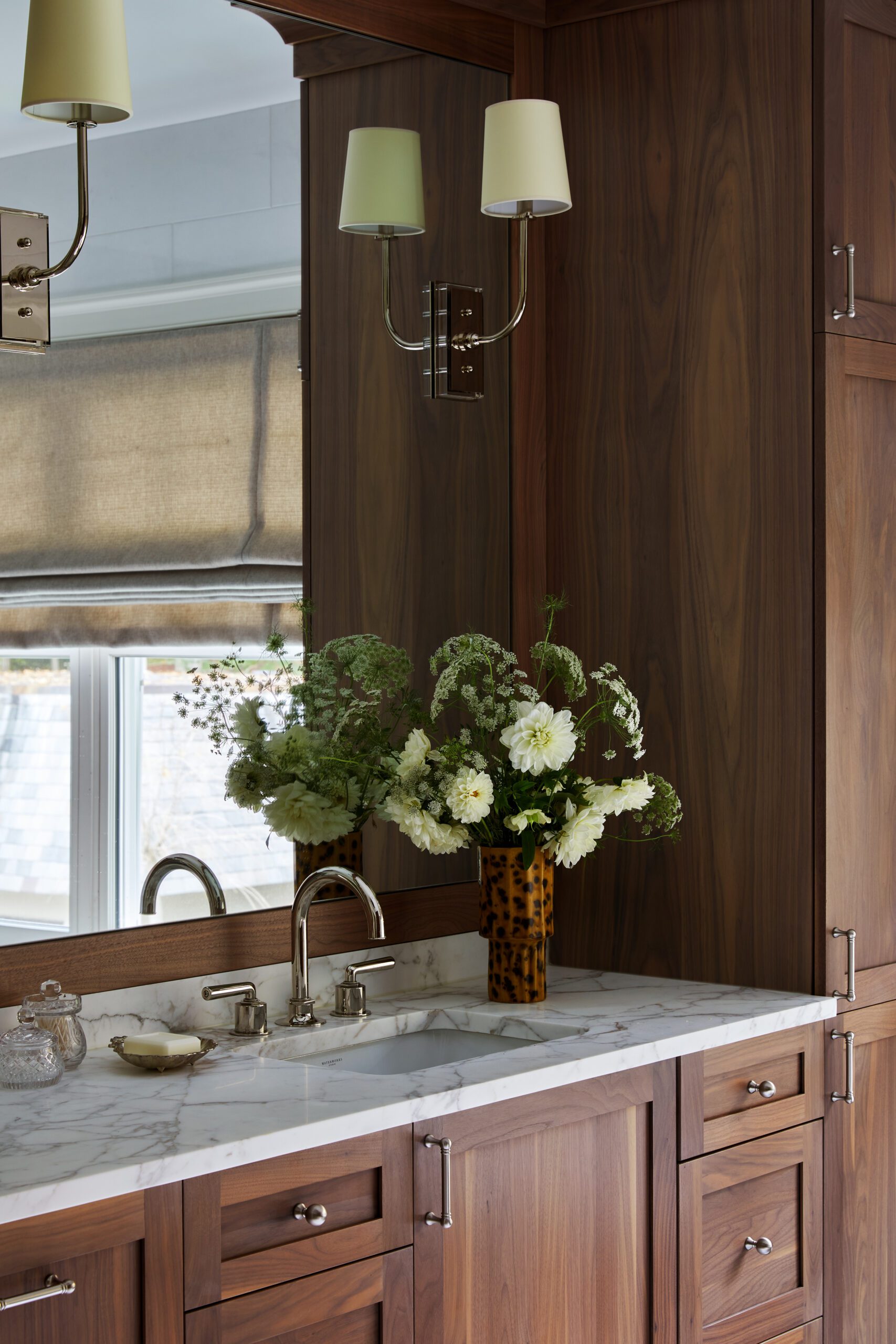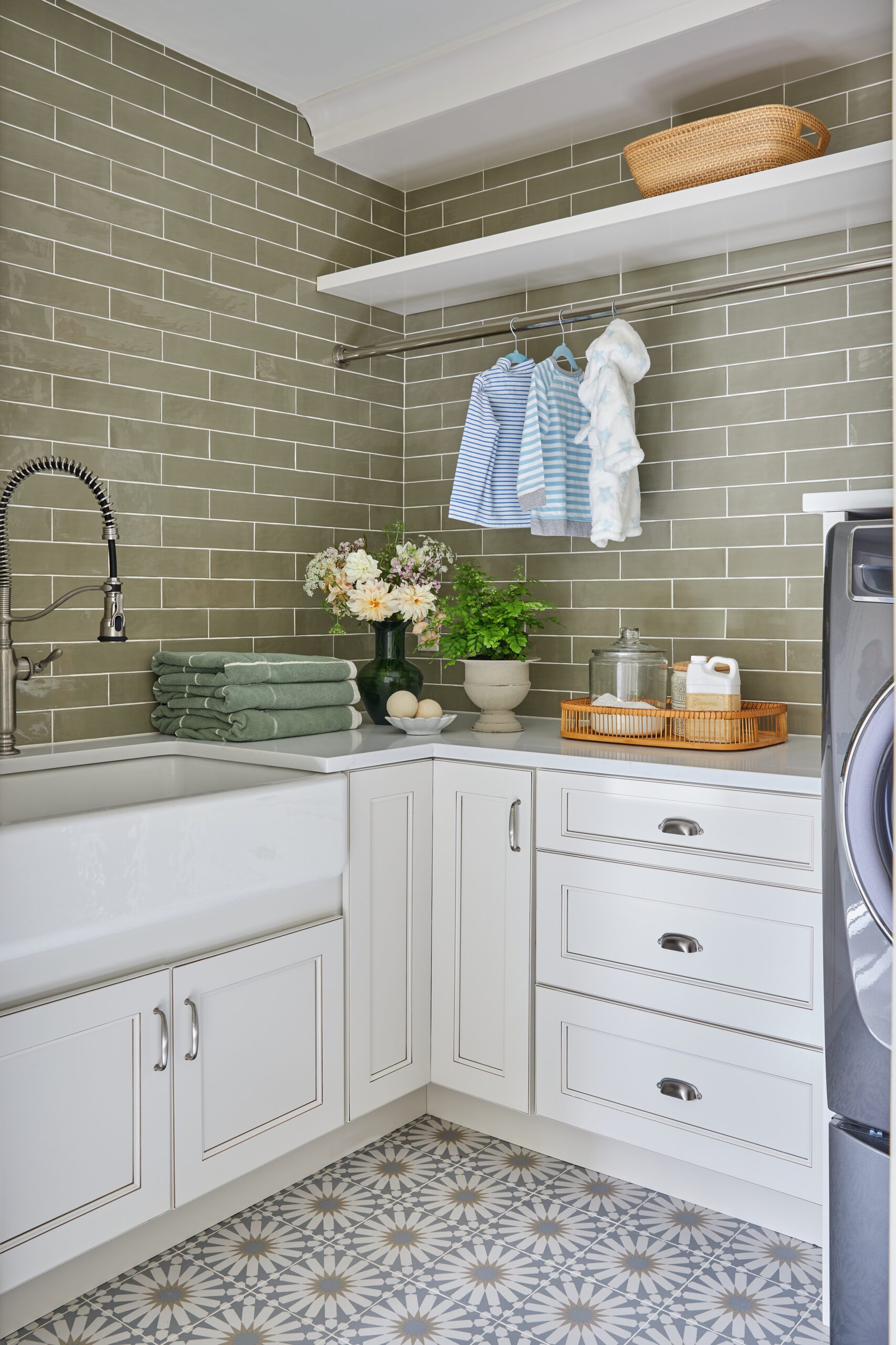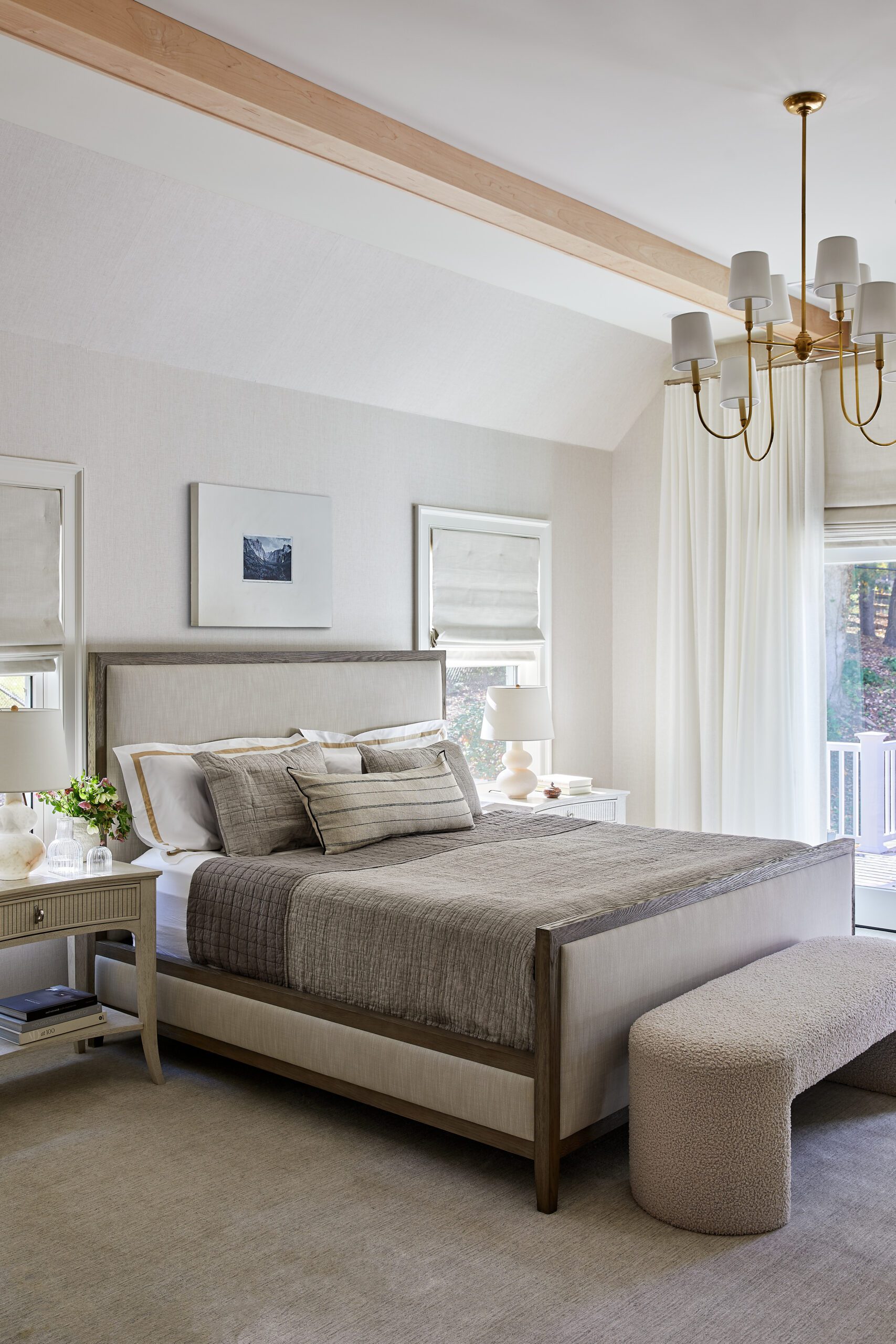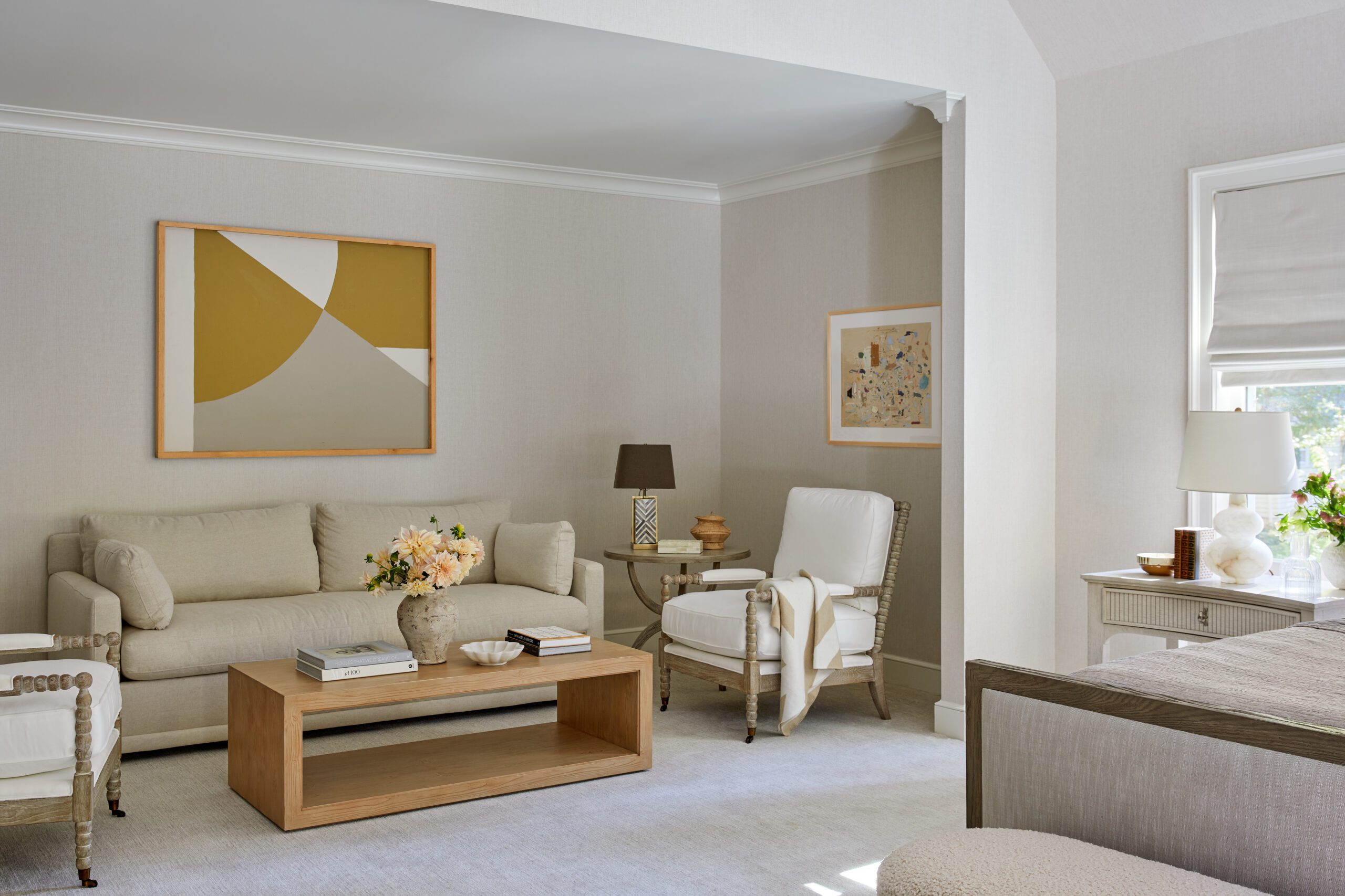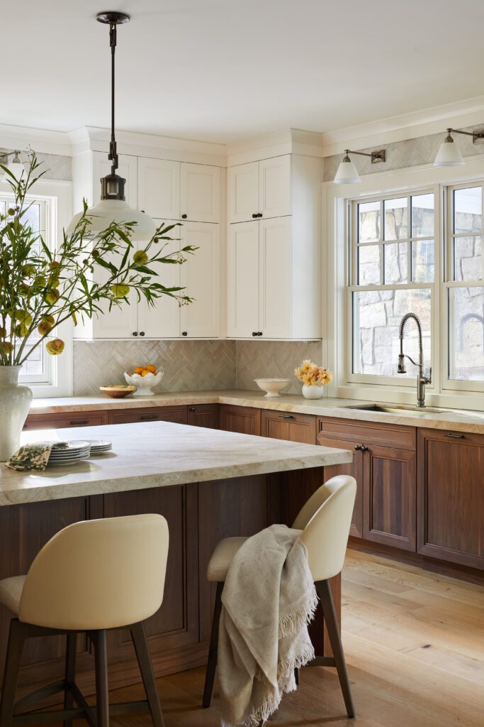 A combination of white and natural wood cabinetry, paired with stunning Artistic Tile countertops and a handcrafted zellige backsplash, strikes the perfect balance between modern elegance and warmth in the kitchen. KKB effortlessly blends wood tones in this space, mixing lights, darks, and whites from the floors to the ceiling. Smart storage details like the accordion pantry doors add function to hideaway everyday essentials and clear the countertops of clutter, while a larger butler’s pantry brings additional prep space.
