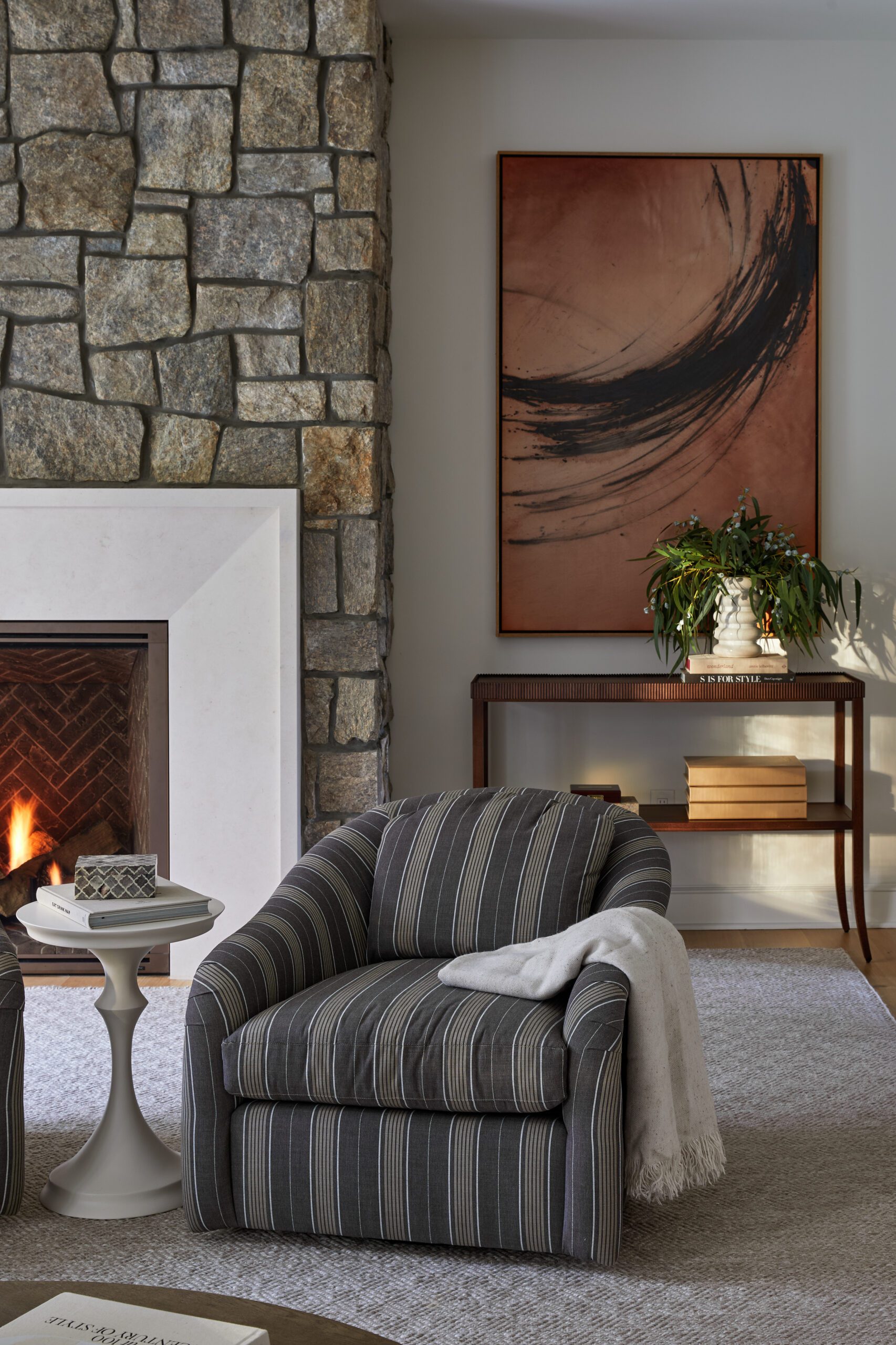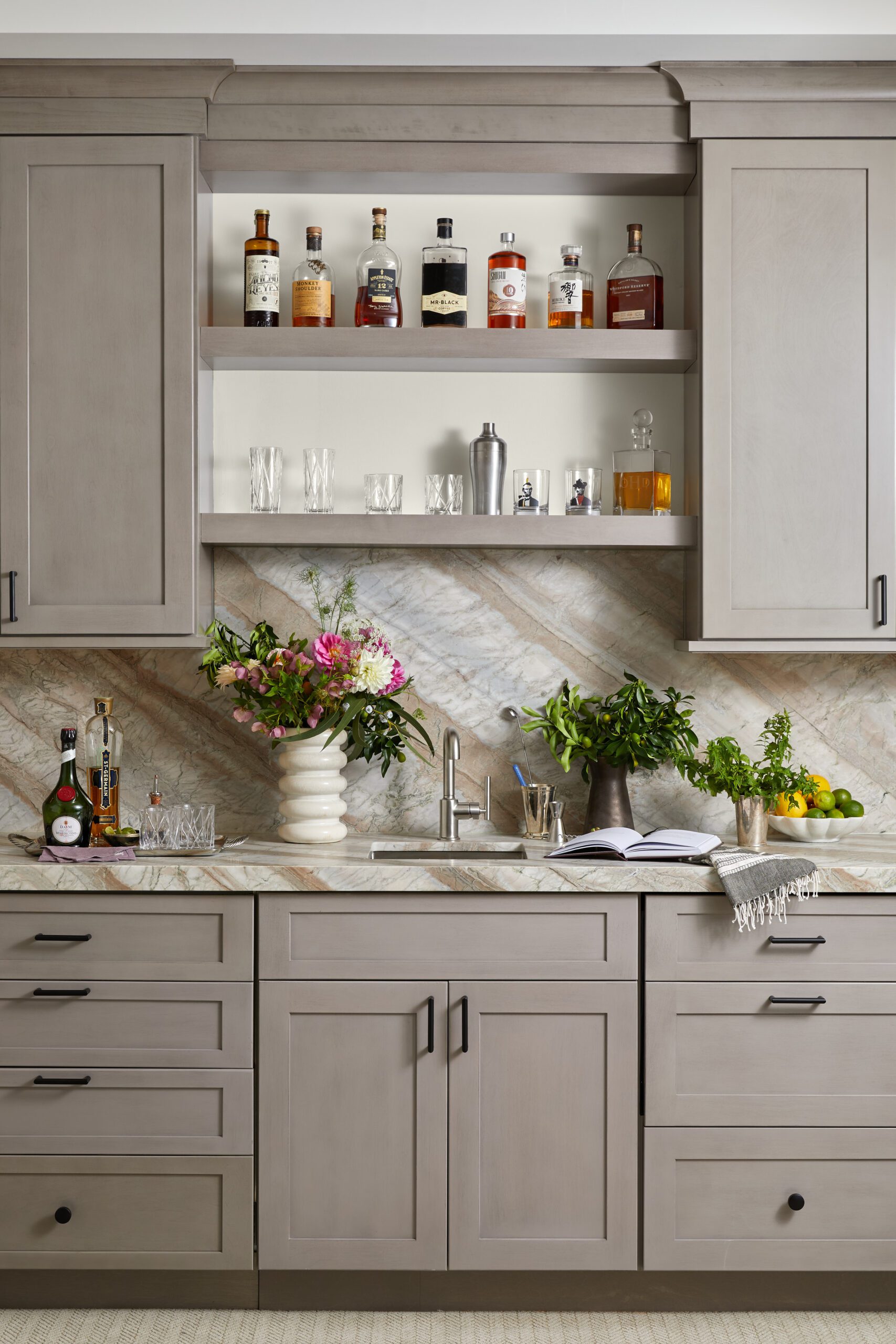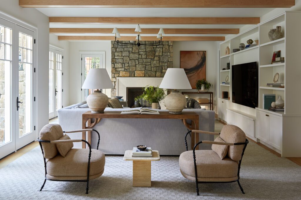 A soft, layered mix of textiles, a limestone fireplace surround, and classic upholstered chairs create a cozy, inviting room for family gatherings. Subtle patterns in the mix bring in a playful look with soft checkers and stripes. Right off the family room, a moody wet bar brings extra entertaining space and adds an unexpected design element that feels like a hidden gem for guests.