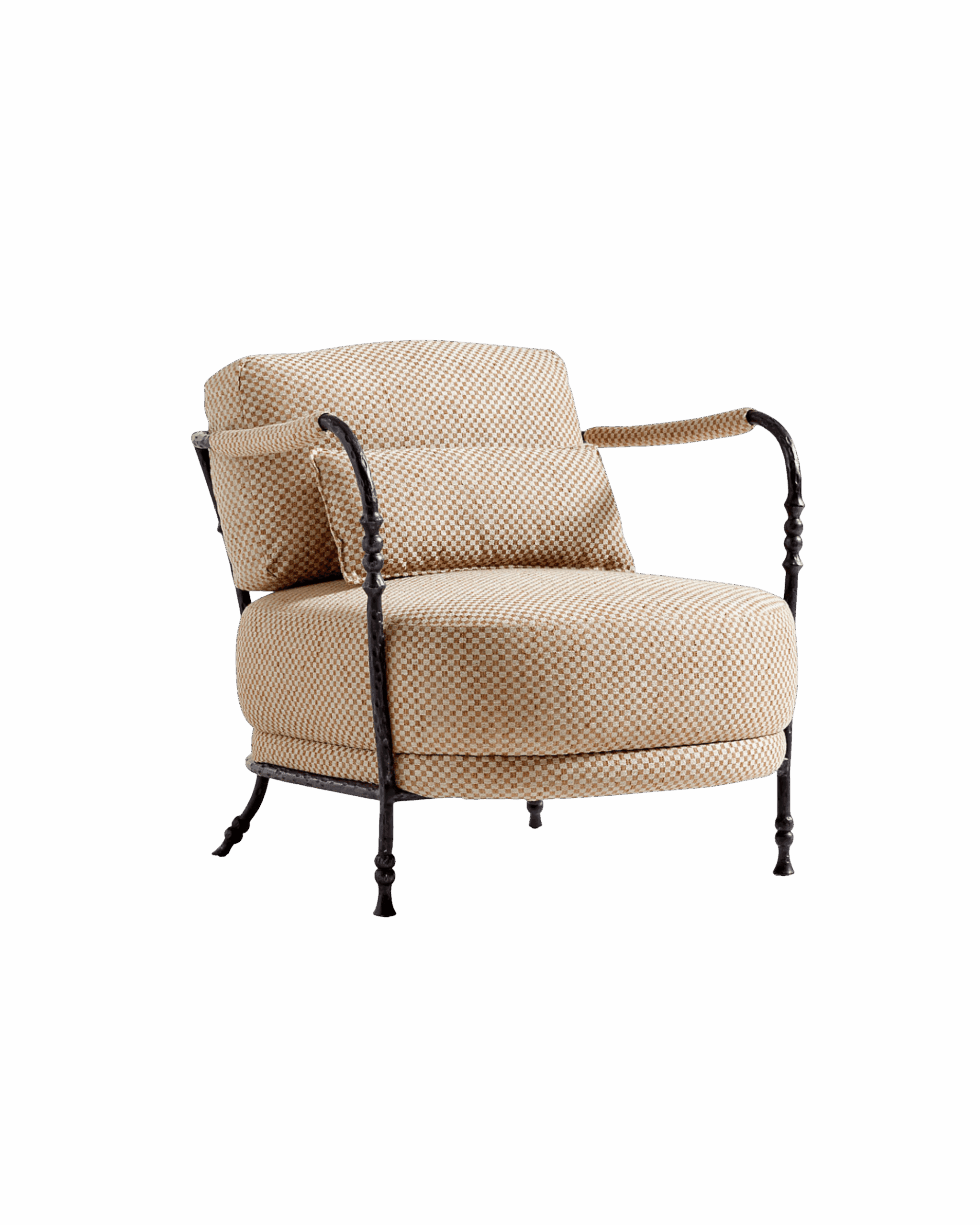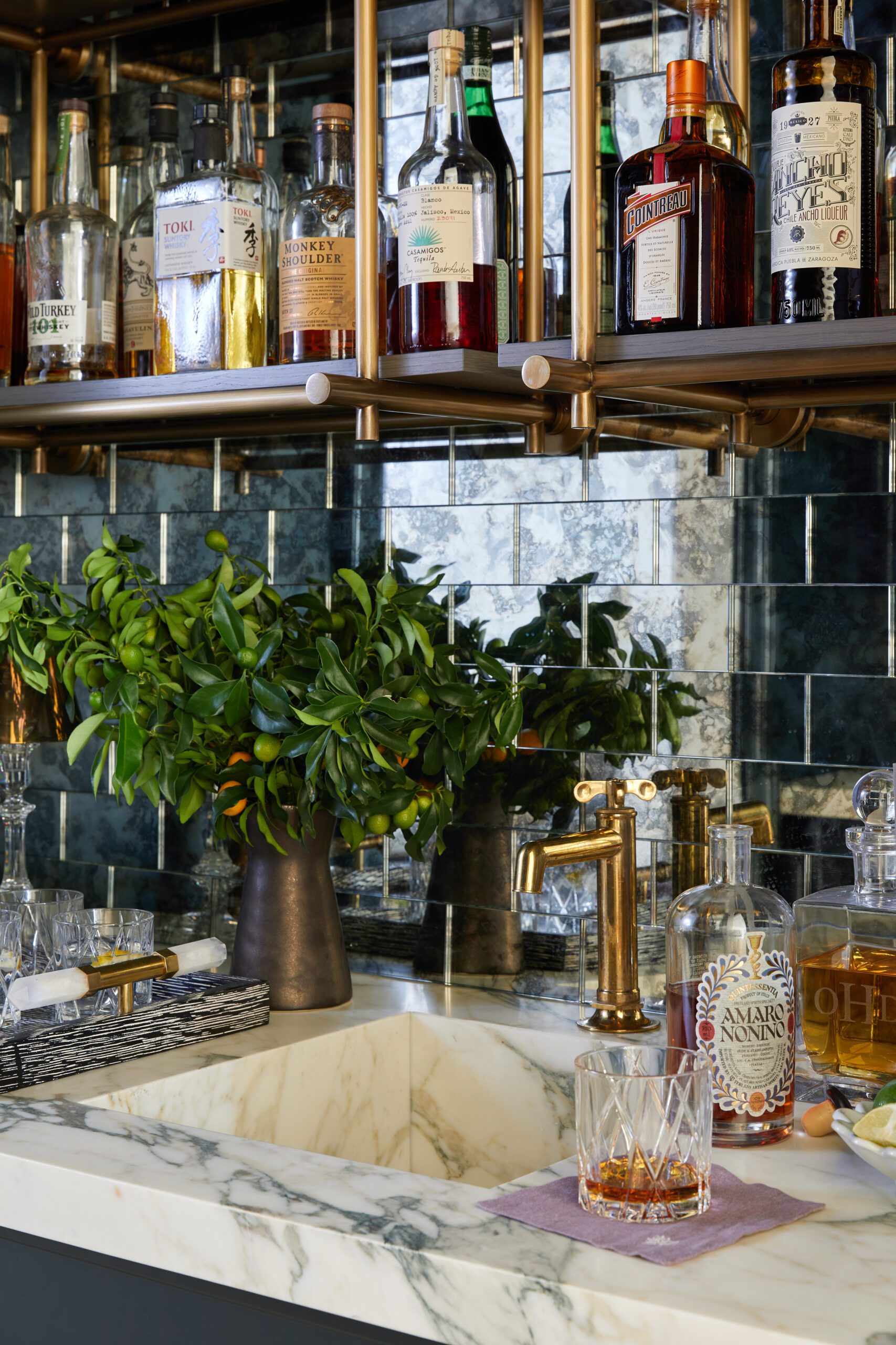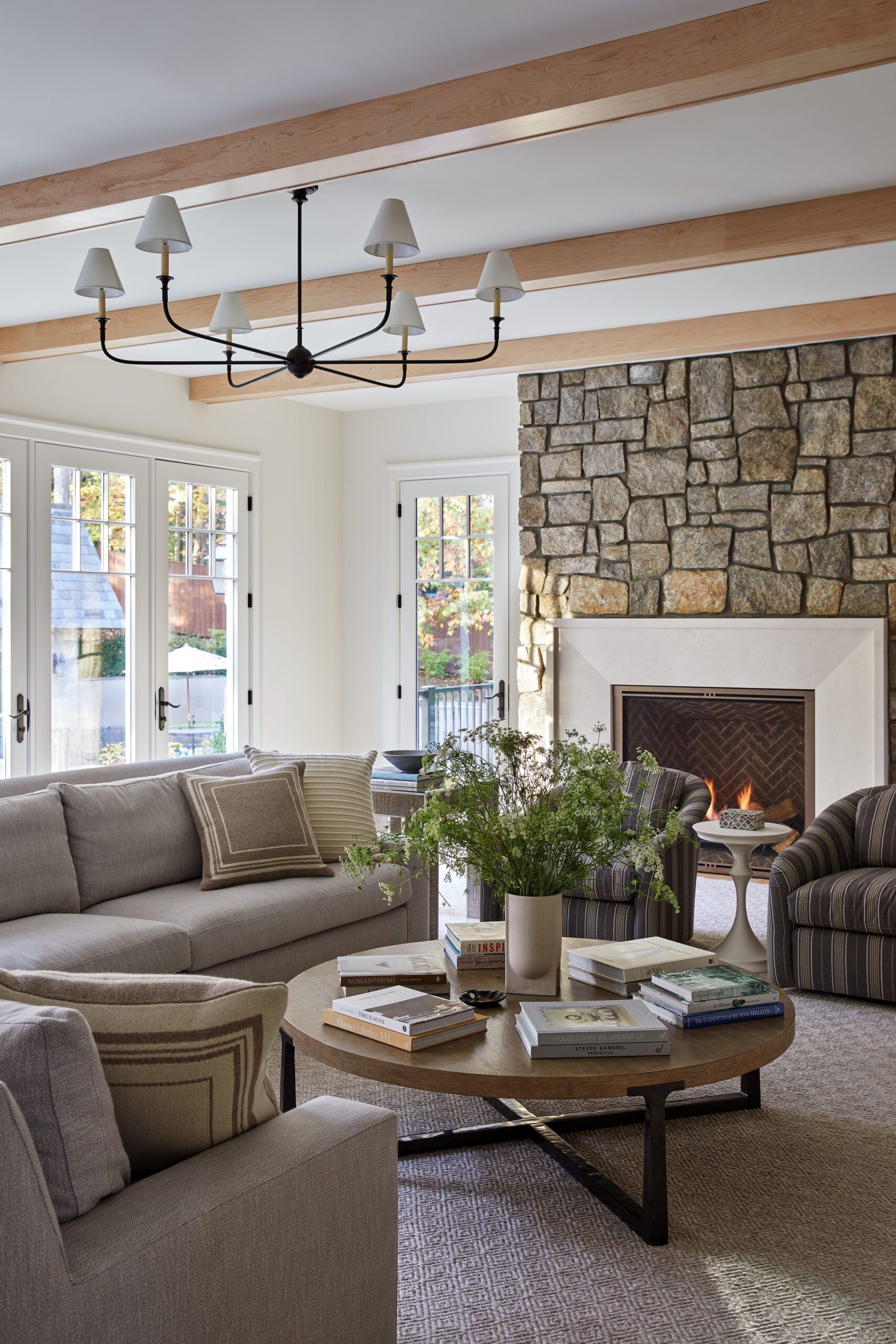 A soft, layered mix of textiles, a limestone fireplace surround, and classic upholstered chairs create a cozy, inviting room for family gatherings. Subtle patterns in the mix bring in a playful look with soft checkers and stripes. Right off the family room, a moody wet bar brings extra entertaining space and adds an unexpected design element that feels like a hidden gem for guests.