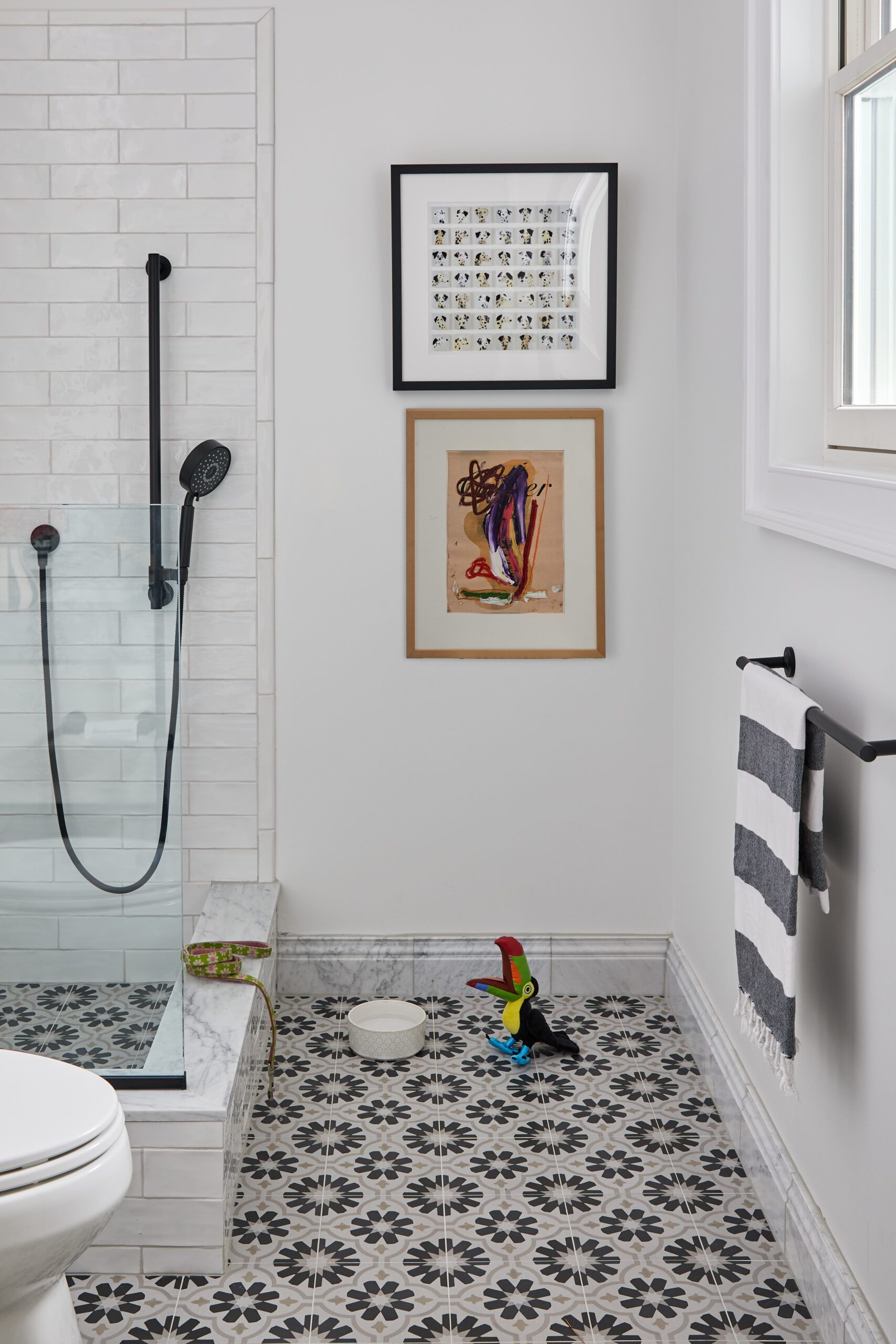 A wood accent wall in the primary bath adds an unexpected layer of warmth and depth, complementing the elegant, modern mosaic tile flooring. A coordinating custom vanity completes the look and brings yet another layer of depth and contrast to the otherwise light and bright space.