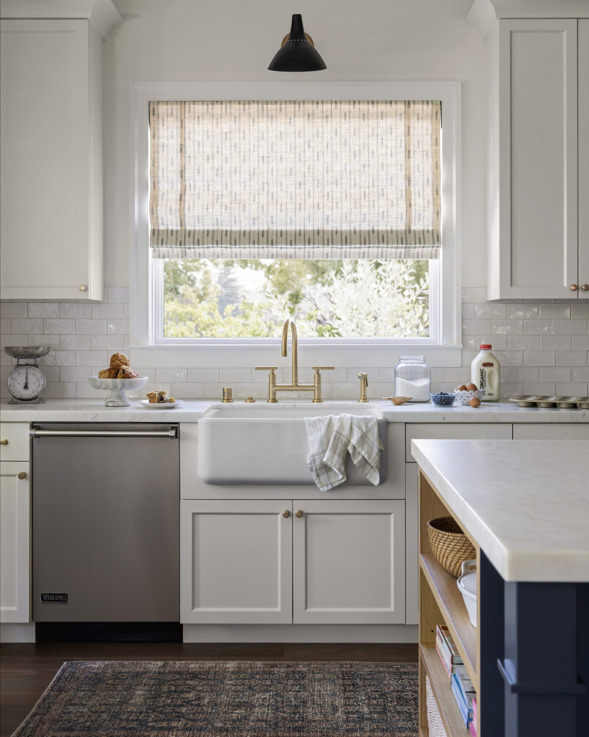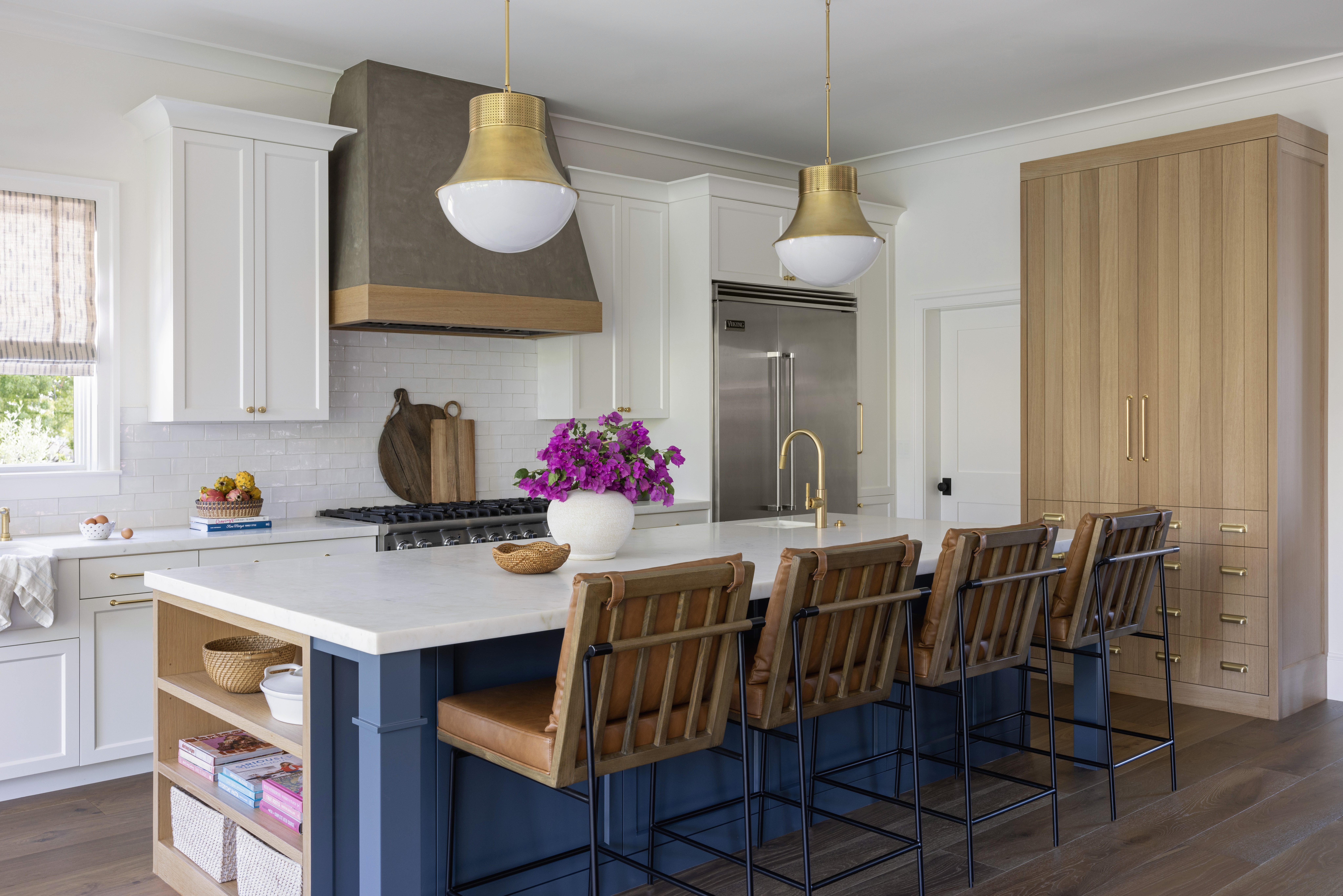 Kitchen cabinetry pairs Benjamin Moore Simply White (a designer-approved white paint) on the perimeter with Sherwin-Williams Sea Serpent on the island.