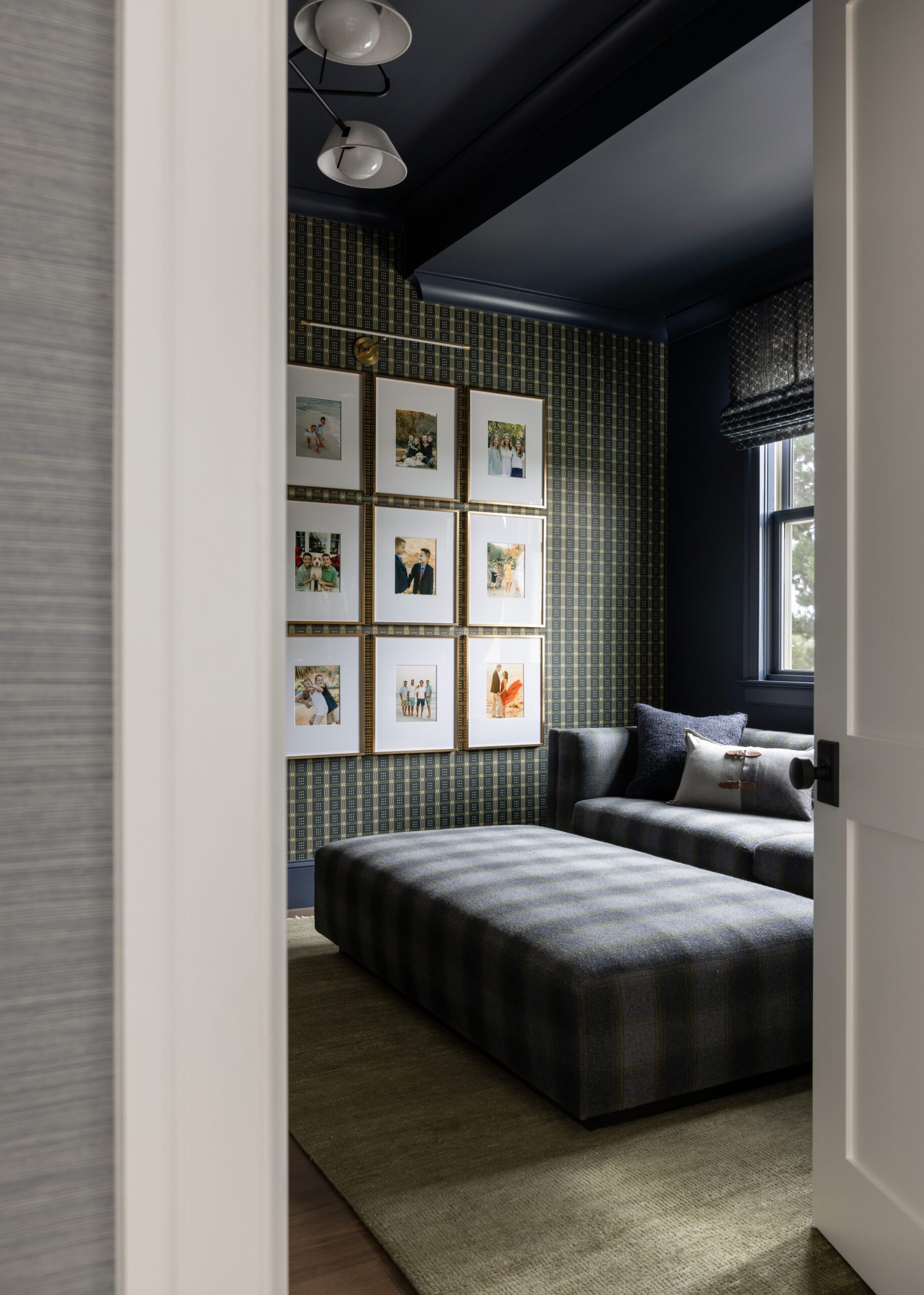 The boys’ room reflects both who they are now and where they come from. Patterned wallpaper emphasizes the shape of the ceiling, while layered bedding in blues and plaids keeps the room relaxed and durable. Sports memorabilia collected by their late grandfather is woven throughout the space, grounding it in family history and nostalgia. Elsewhere in the home, personal details come through in quieter ways, from the patterned office to a powder room anchored by meaningful artwork.