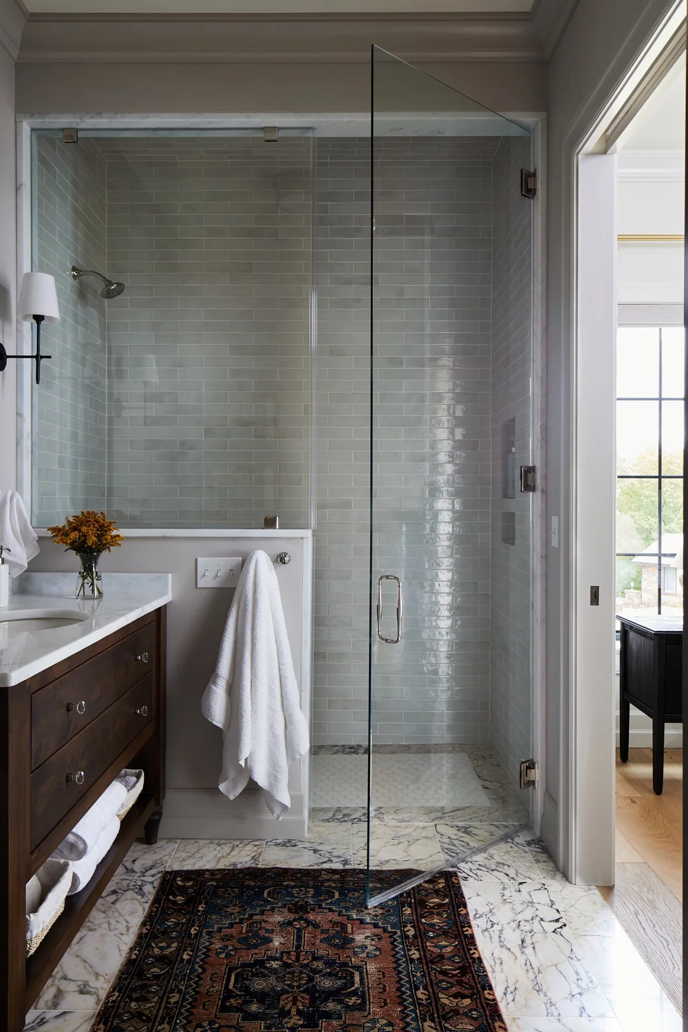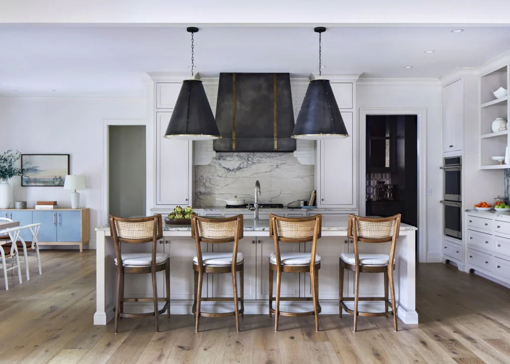 The kitchen serves as both the visual and emotional center of the home. A custom patinated steel hood with antiqued brass strapping anchors the space, creating an elegant focal point without overwhelming the room. Paired with a dramatic marble slab backsplash and countertops, the materials quietly set the color palette for the entire house.