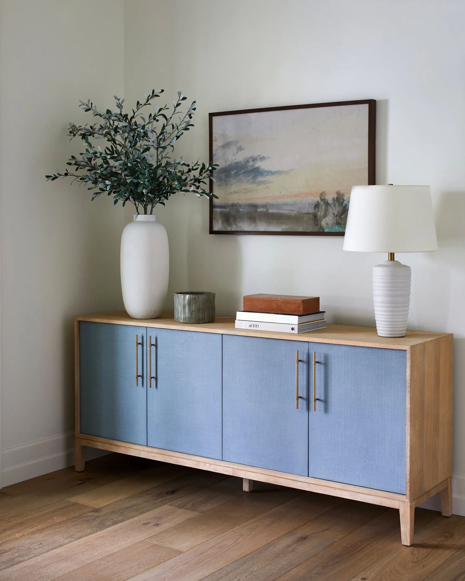 With tall ceilings and generous proportions, the living room was designed to feel expansive yet unmistakably comfortable. Botanical elements, soft blue ceramics, and warm leather accents gently reference the lake and landscape just outside the windows.
