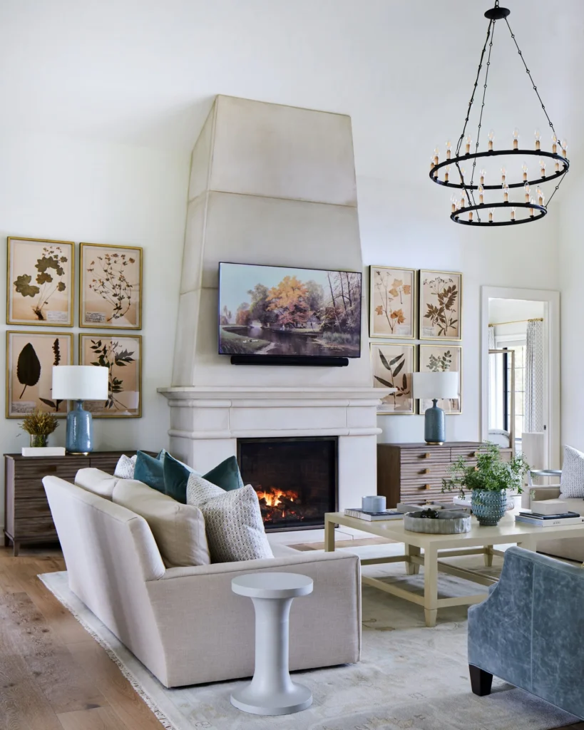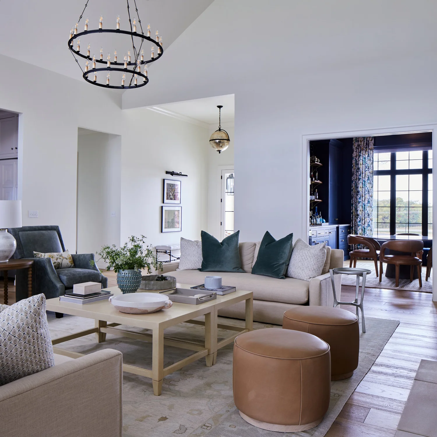 A custom cast stone fireplace provides architectural weight, flanked by Mr. Brown Home dressers to maintain cozy proportions within the large volume. A Loom & Co rug grounds the seating area, while raffia and leather details subtly repeat materials found throughout the kitchen and adjoining spaces.