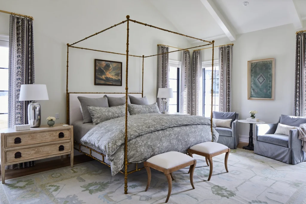 Calm, layered, and quietly elegant, the primary bedroom captures the heart of the “refined retreat” concept. A gold-finished bed with delicate detailing becomes the room’s focal point, while rustic bedside dressers and relaxed slipcovered chairs soften the overall feel.