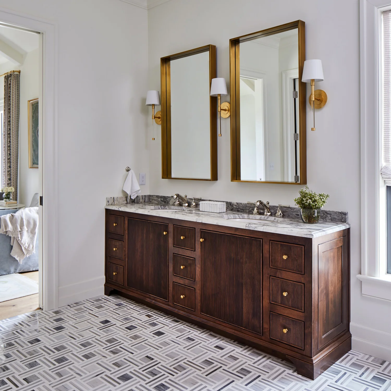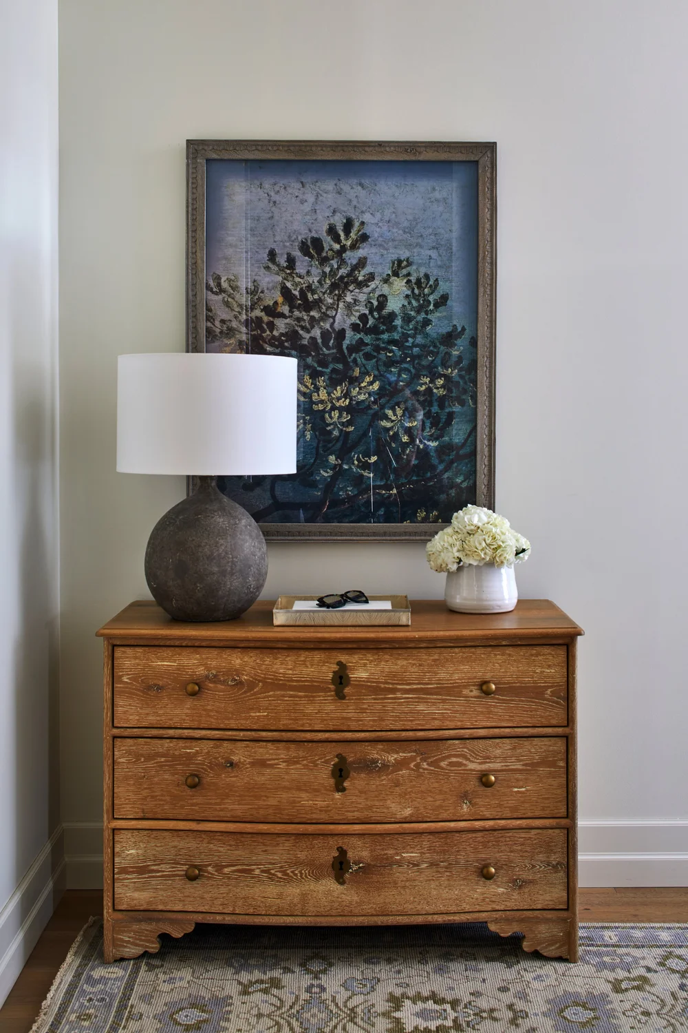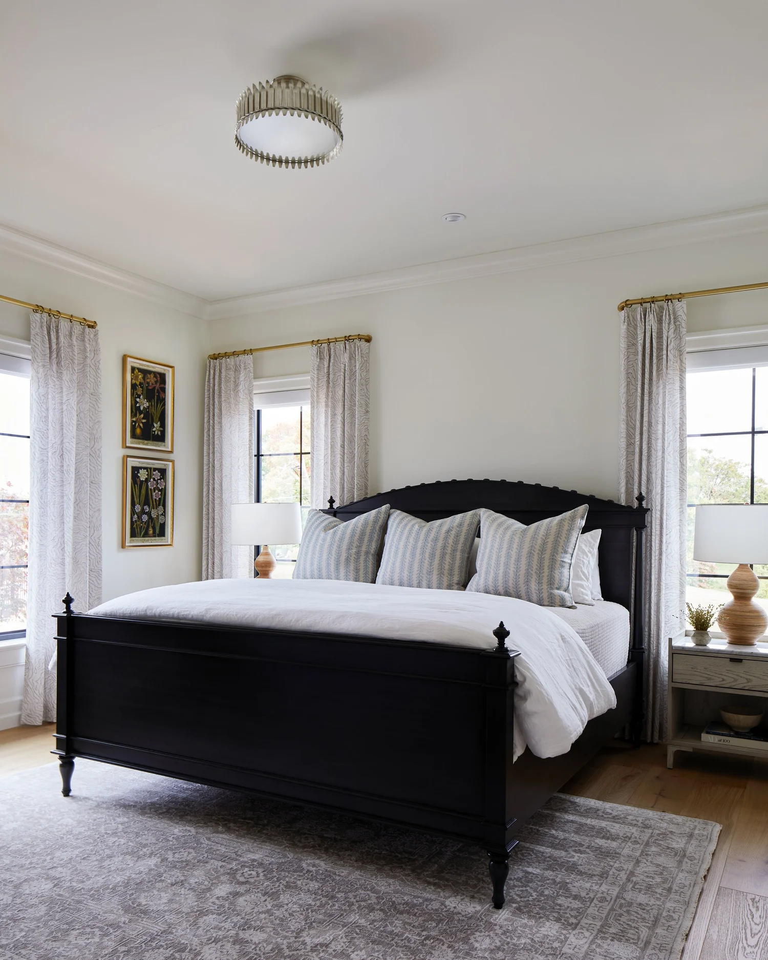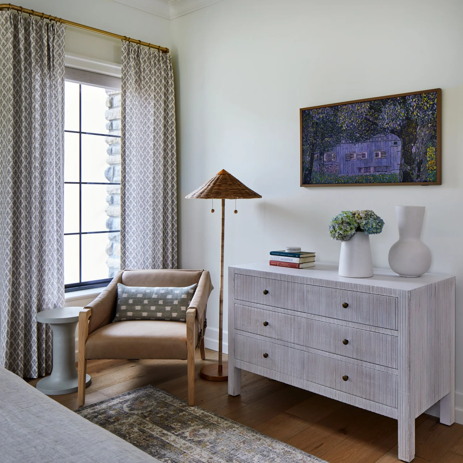 Scale played a key role in the room’s success. Rather than traditional nightstands, wide dressers were used on either side of the bed and paired with generously sized lamps, creating visual balance that feels tailored to the room’s generous footprint.
