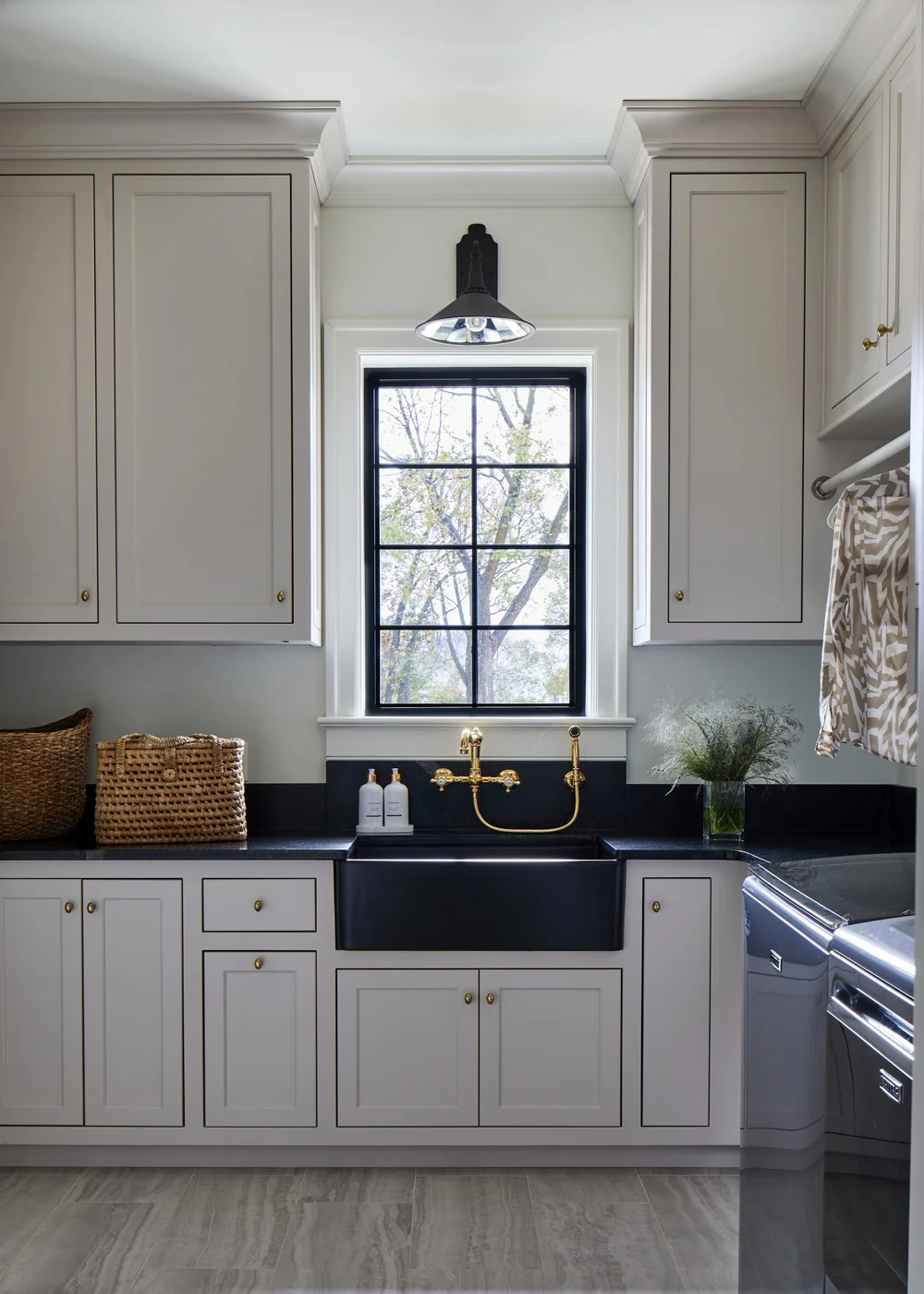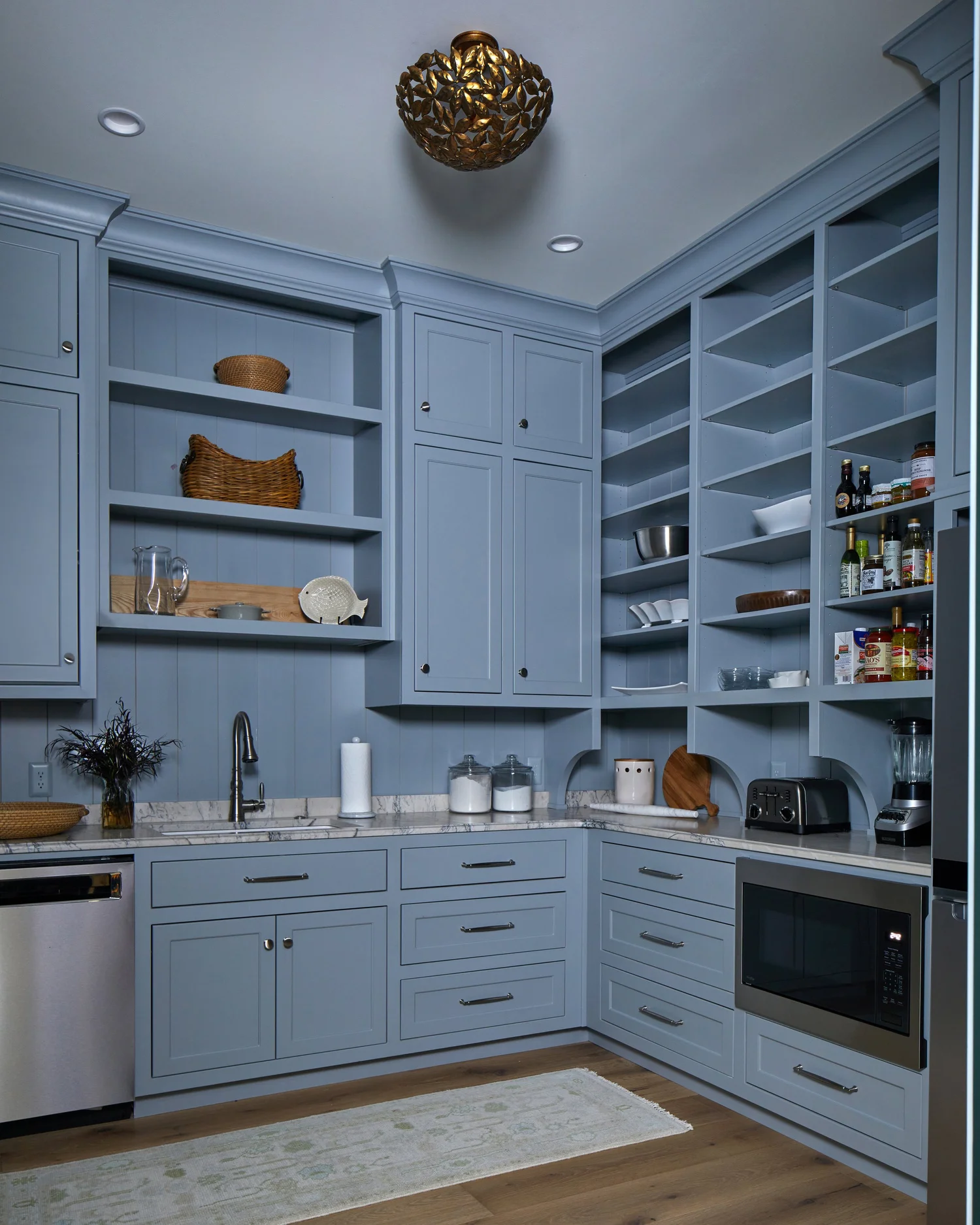 Function was just as important as beauty. Every inch of cabinetry was custom designed, from pull-out spice and utensil storage flanking the range to full-height dish cabinets and fully integrated appliances. An apron-front sink introduces just enough character to keep the space from feeling overly new.
