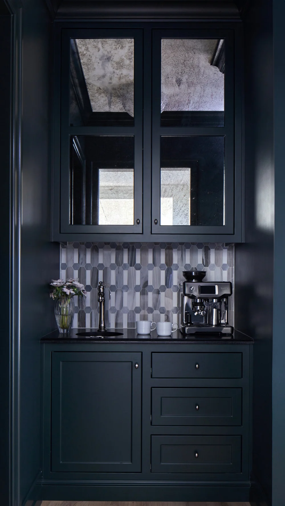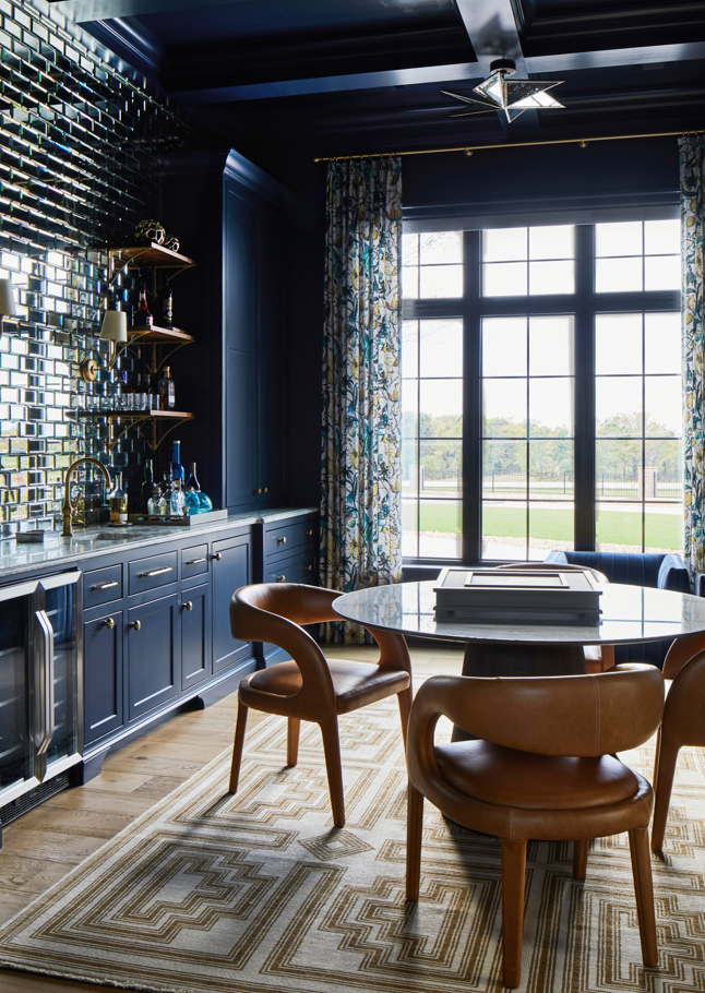 The most dramatic and personality-driven space in the home is the card room. Fully wrapped in Benjamin Moore Hale Navy—including the cabinetry and coffered ceiling—the room feels intimate despite its generous size.