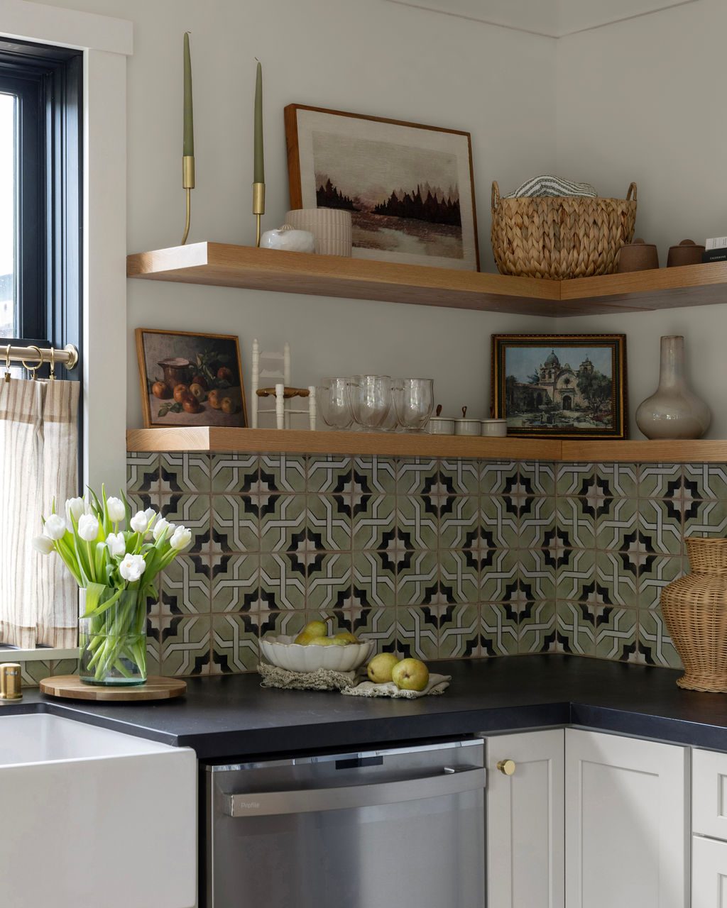 The kitchen is both fun and functional, with a cabinet layout that makes the most of a small footprint and a backsplash that brings a little joy to the everyday. Cristina chose Bedrosians’ Casablanca 5×5 matte tile in Torres for the backsplash—a soft, slightly playful pattern that adds personality without overpowering the room.