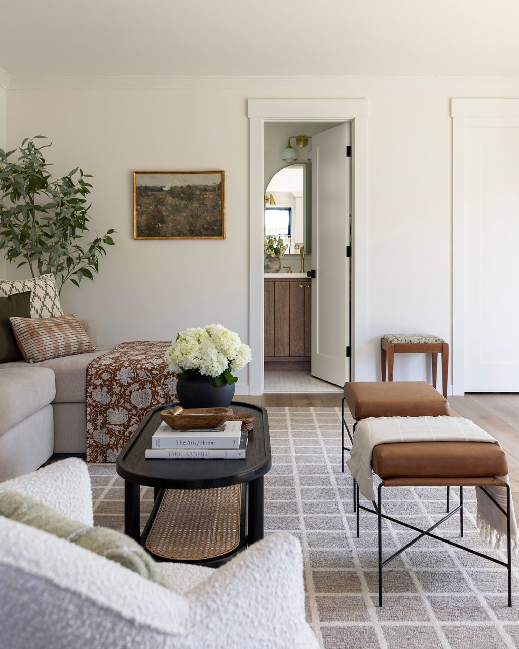Designed with flexibility in mind, the open-concept living area is part cozy hangout zone, part guest-ready retreat. Cristina kept things light and bright with a fresh palette (Benjamin Moore’s White Dove does a lot of quiet heavy lifting here) while layering in soft furnishings and artful decor that makes the space feel welcoming. A calming mix of cream, sage, blue, and rust tones helps ease the mind and brings a sense of balance to the room. And the best part? The space offers enough seating for every occasion—guests can sprawl on the sectional, lounge in the chair, or sit on the ottomans while looking out to enjoy the scenery.