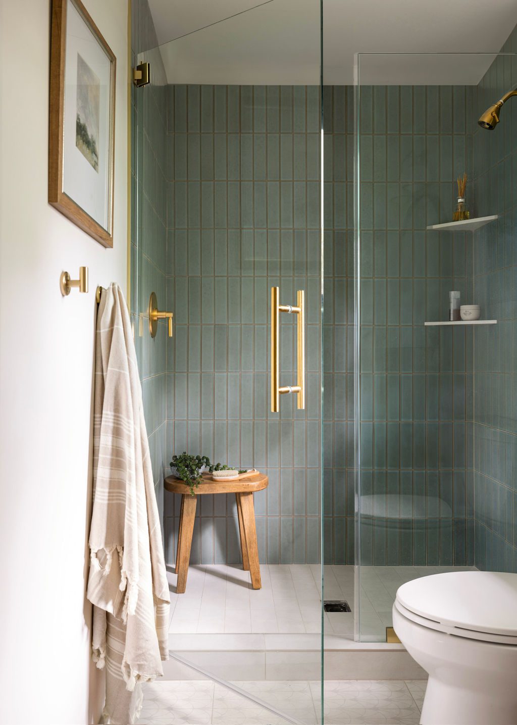 In the bathroom, Cristina paired a relaxing green subway tile from Bedrosians in the shower with a richly toned wood vanity from JKath Cabinetry. A lightly-colored (Bedrosians Wave Honed Fan Deco Porcelain Tile) floor keeps things grounded and airy, while a brass faucet from Symmons adds a polished finishing touch. The result is layered and serene, with just enough contrast to keep it interesting.