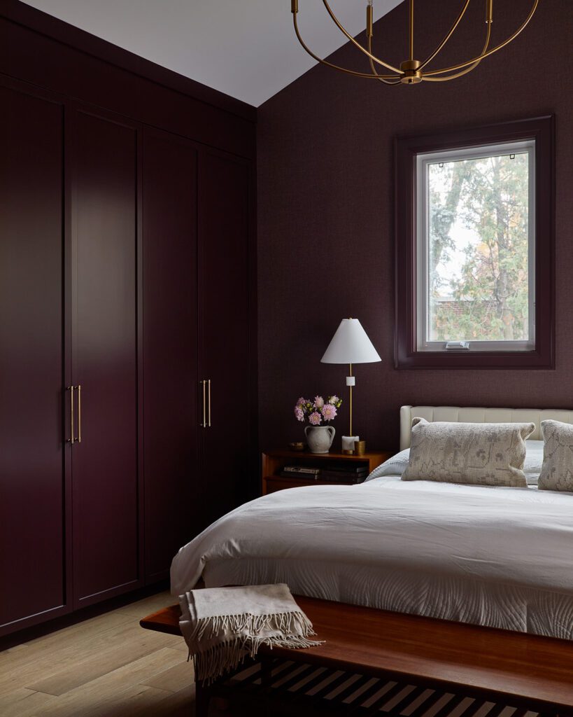 In the kitchen, a striking brass hood anchors the design, giving the space an air of refinement that feels both playful and enduring. Paint colors bring further depth: Farrow & Ball’s Studio Green on cabinetry, Sherwin Williams’ Dovetail on wainscotting, and Brinjal, a rich aubergine, in the main bedroom. Each choice infuses the home with a distinctive mood while maintaining a cohesive narrative.