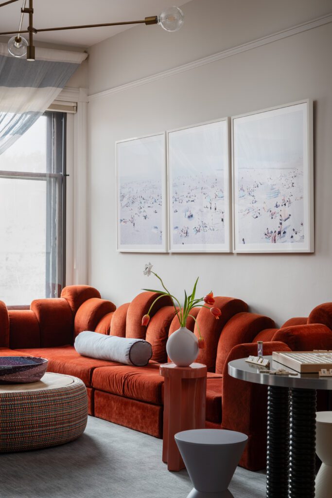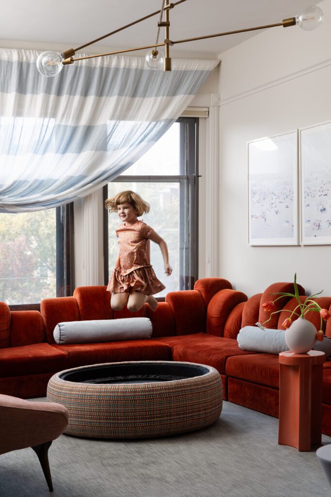 This space takes on the true meaning of a family room, with something for everyone of all ages. A vintage Dromedaire sofa by Hans Hopfer for Roche Bobois centers the space in its original upholstery. Each sofa piece is moveable, perfect for customizing the room. Bethany designed the ottoman in the middle with Pierre Frey’s Pagopago fabric in “cactus,” custom-made to fit her girls’ indoor trampoline. Remove the lid to start bouncing! A custom Stewart Studio green resin games table by the fireplace adds another level of color and playfulness. Prince Aha stools by Philipe Starck for Kartell double as storage for Magnatiles, building blocks, and other toys.