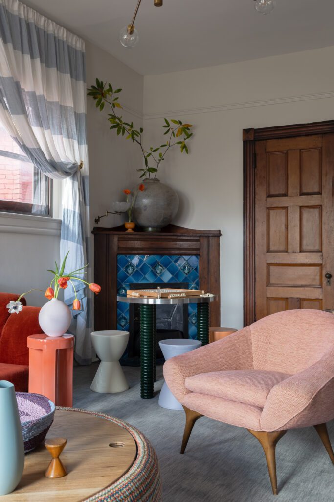 By refinishing the floors with a lighter, matte stain, keeping the walls light, and playing off of the diamond leaded glass in the front door, Bethany expertly kept the newly incorporated aspects of the design from feeling detached from the original. Complete with an ottoman that doubles as an indoor trampoline, colorful stools designed to store magna tiles, and a pink mirrored acrylic hood surround in the kitchen; this home is a true joy. Scroll on to step inside this vibrant, history-filled space.