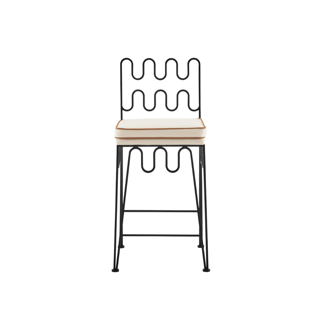 As avid hosts, Julia and her husband required plenty of seating and child-friendly features. In the living room, nearly every piece boasts curved edges—a stylistic choice that nods back to the project’s ‘practical yet purposeful’ brief. Similarly, the kitchen was designed to be a natural gathering space that welcomes adults and children alike. Jean Royère-inspired “YoYo” bar stools inject a French modernist perspective while the island’s bold veining creates a dramatic focal point.