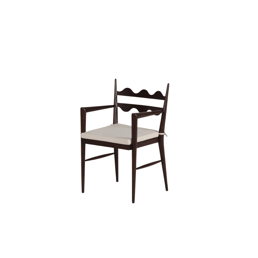 Mid-century Italian design is the clear red thread throughout the home. From the dining area’s vintage Italian table to the 1950s wall unit from Milan, Julia was intentional in sourcing era-appropriate pieces while allowing room for visual tension through varied design genres. Custom elements like the Stilnovo-style chandelier and the Jean-Michel Frank-inspired parchment coffee table reinforce that balance, showcasing Julia’s masterful blend of old and new.