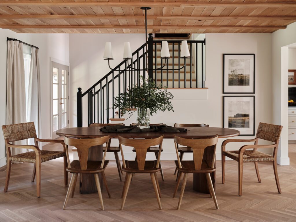 After removing the glossy prefinished maple flooring, Jessica added site-finished white oak herringbone floors. White oak incorporated into the ceiling creates even more warmth and draws the eye up. While the floor plan had a great flow originally, the design called for more openness in a few areas. Jessica designed a larger case opening between the dining table and the kitchen to create a more expansive gathering space, allowing the rooms to flow naturally.