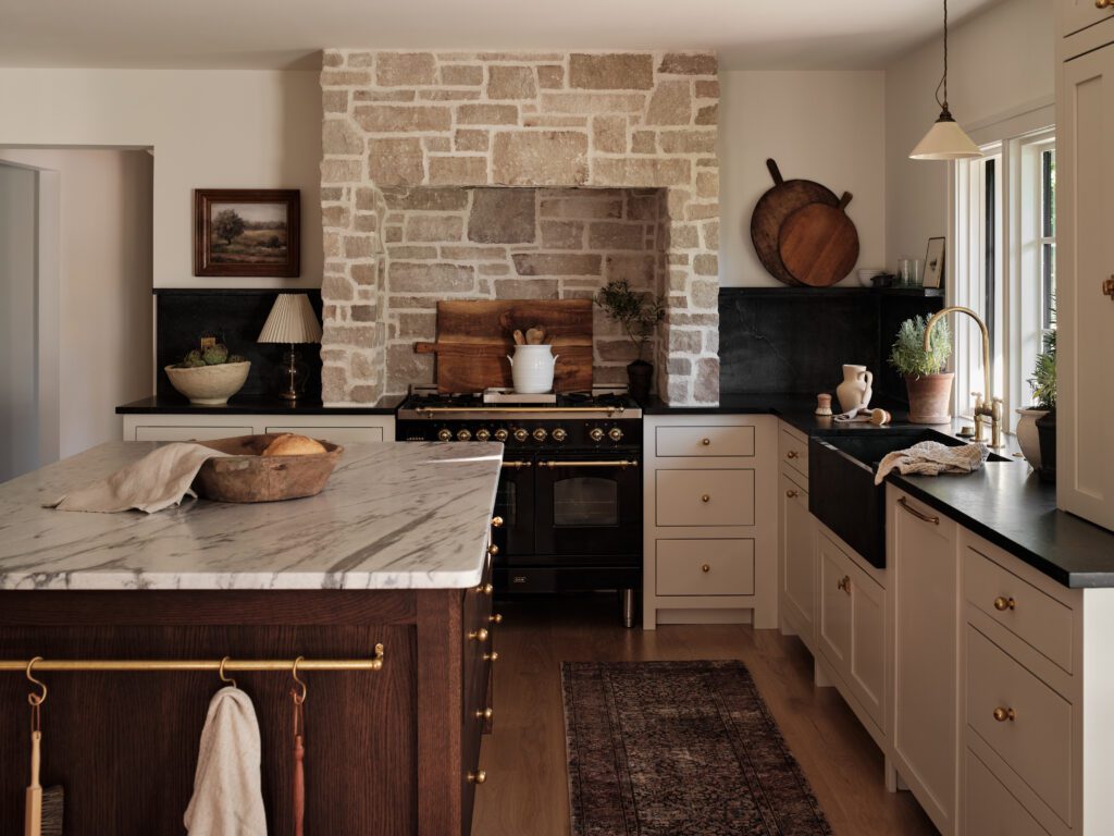 A triple casement window above the sink creates abundant natural light and a stunning limestone range alcove featuring an ILVE Nostalgie range acts as a statement piece. The custom inset cabinetry painted by Benjamin Moore Natural Cream and the white oak island, finished by The Hardwood Co., complete the beautifully refreshed space.