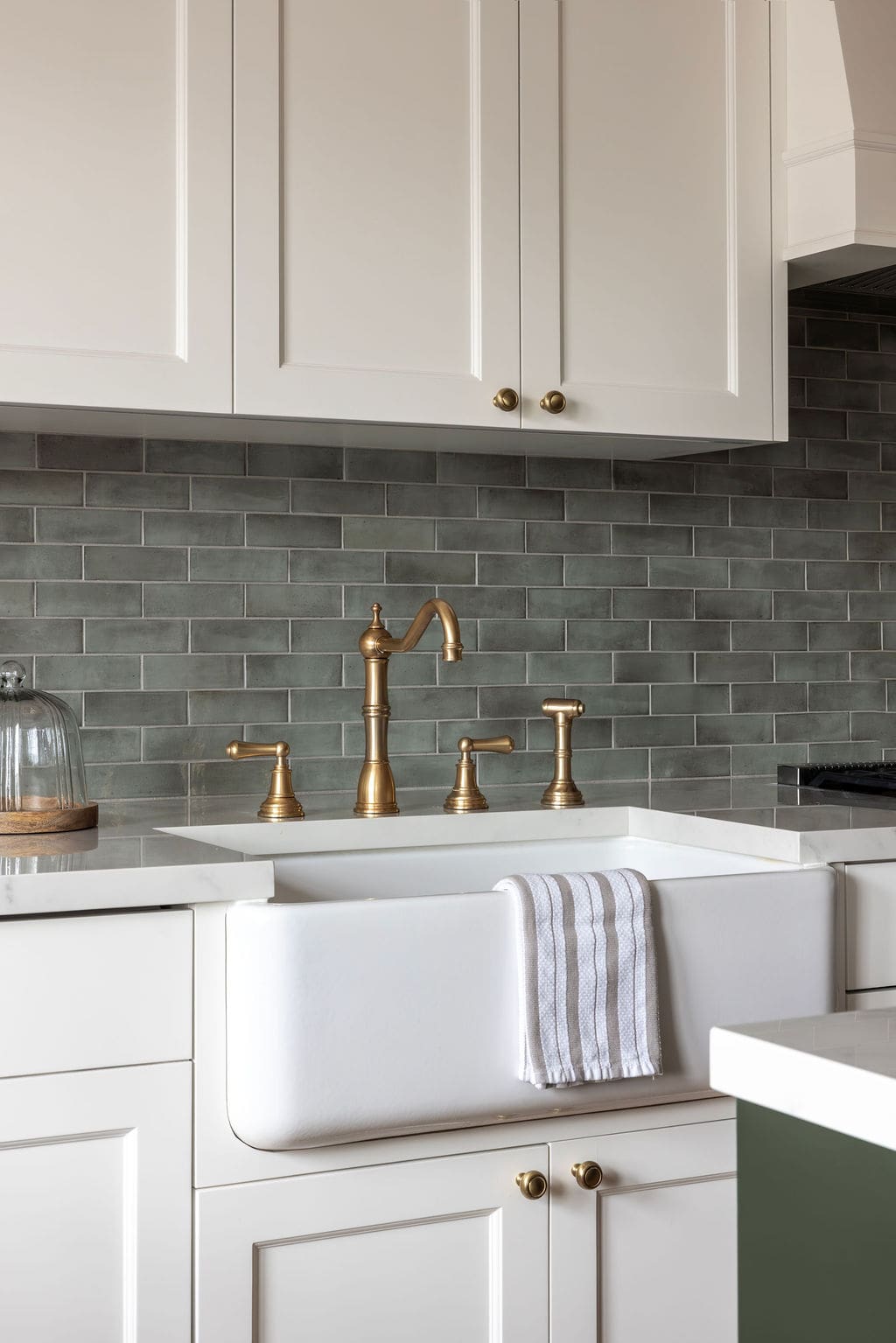 From the start, the kitchen set the tone for the entire home. Original wood floors and antique beams ground the space in warmth, offering an immediate sense of continuity with the building’s past. Shapiro introduced subtle color through the island, painted in Benjamin Moore’s Vintage Vogue—a muted, sophisticated green that feels both fresh and timeless.