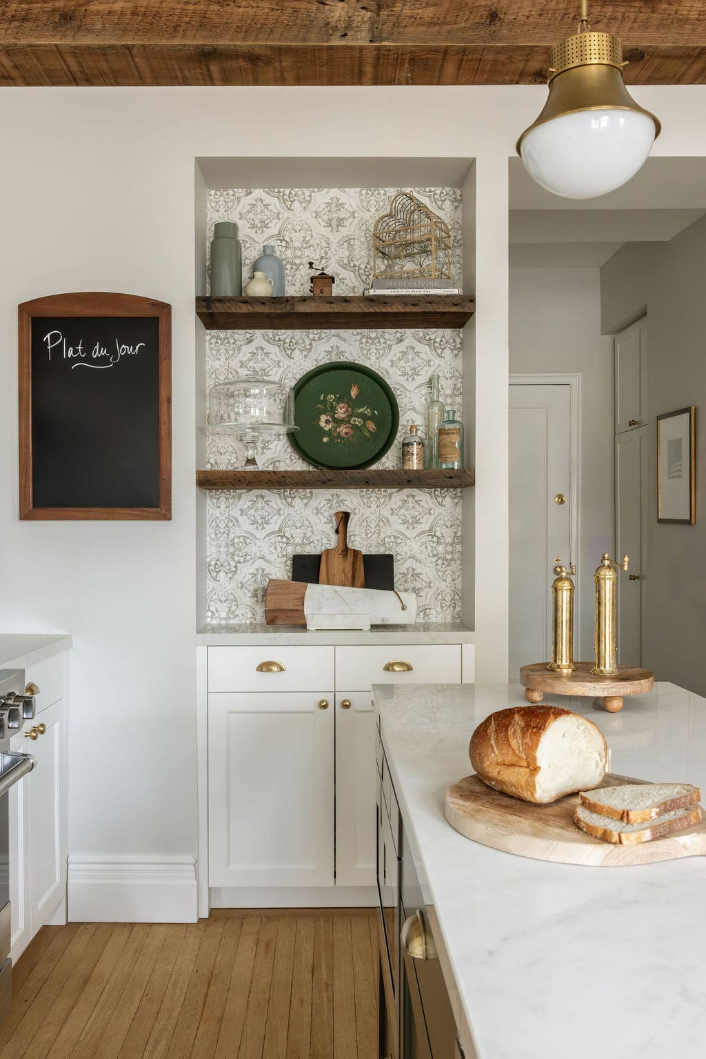 The backsplash, crafted from artisanal Ann Sacks tile, adds texture and depth while complementing the kitchen’s understated palette. One of the most charming architectural moments is a wall niche outfitted with antique wood shelving, now home to the couple’s carefully curated collection of antiques gathered from Parisian markets and upstate New York shops. The result is a kitchen that feels layered and lived-in, never overly designed.