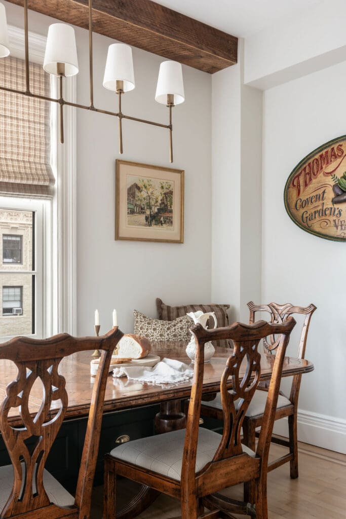 The adjacent dining area centers around the couple’s longtime dining table, reimagined with reupholstered chairs and a custom bench to accommodate growing family gatherings—including visits from new grandchildren.