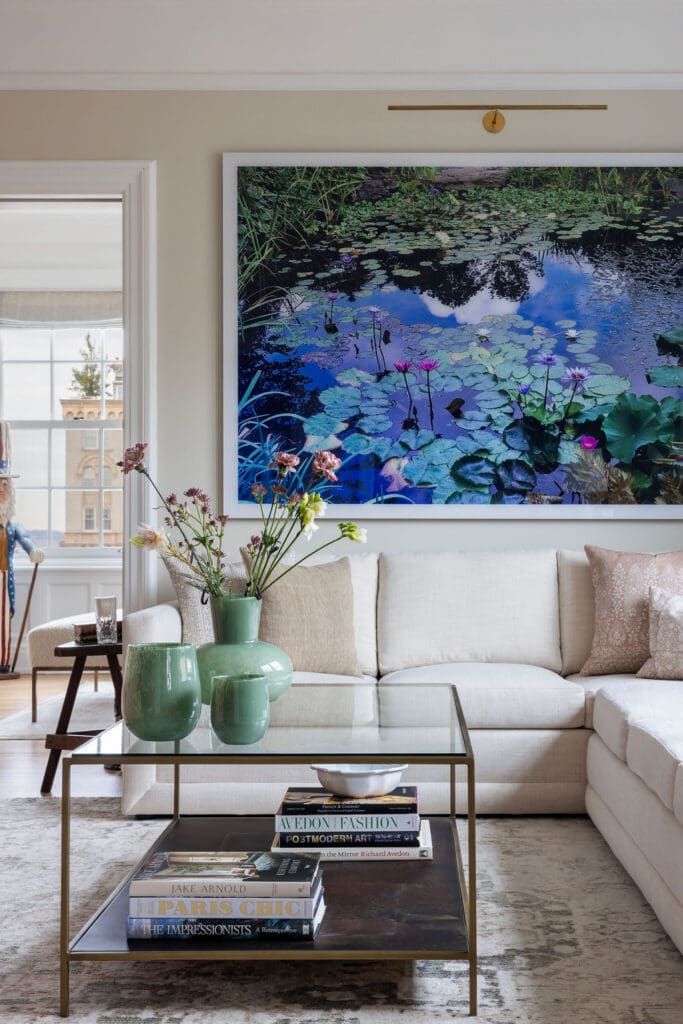 Bathed in natural light, the living room was envisioned as a serene retreat for both quiet mornings and lively family visits. Shapiro leaned into a soft, airy palette that allows the clients’ existing art collection and antiques to shine while maintaining a sense of cohesion.