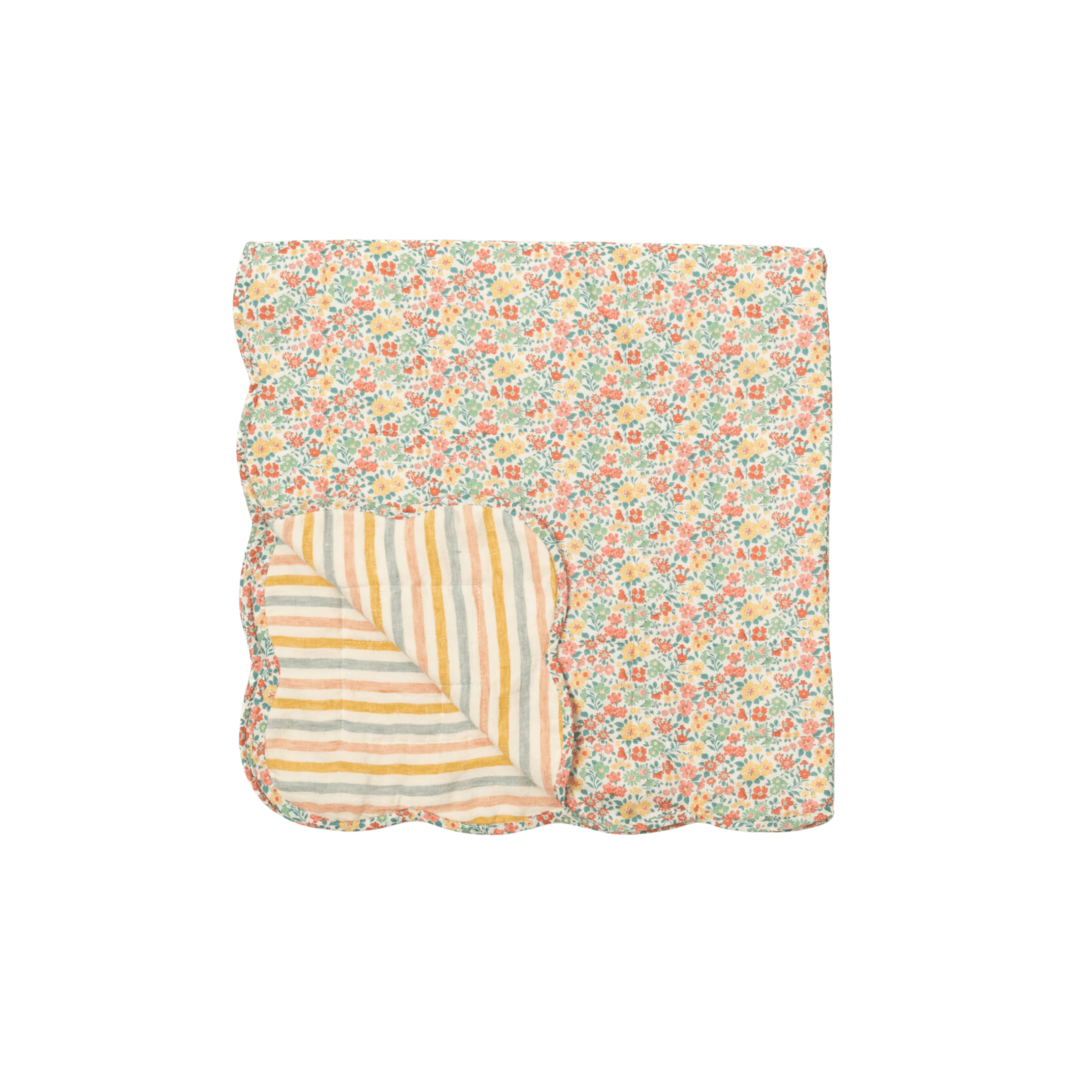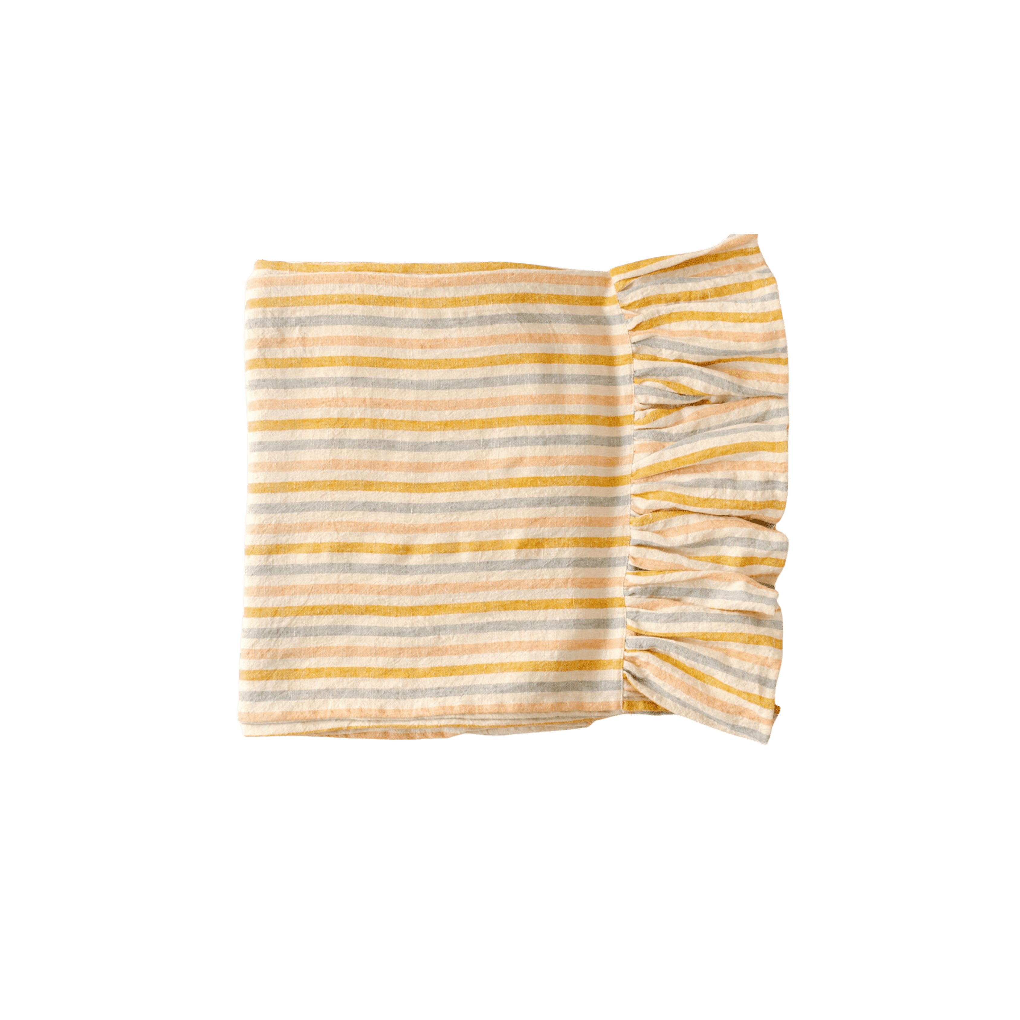 Once we found out we were having a girl, we started pulling softer, more romantic prints and fabrics as options. Upholstery fabrics were some of the first elements we decided on. Florals and stripes were an obvious choice for us in keeping with our English Tudor-style home. I instantly fell in love with this darling daisy print and the sweet yellow floral print by Lulie Wallace that we incorporated into the window treatments and bedding. We layered in ruffled rainbow linen bedding to add a playful, whimsical element and bring in a bit more color.