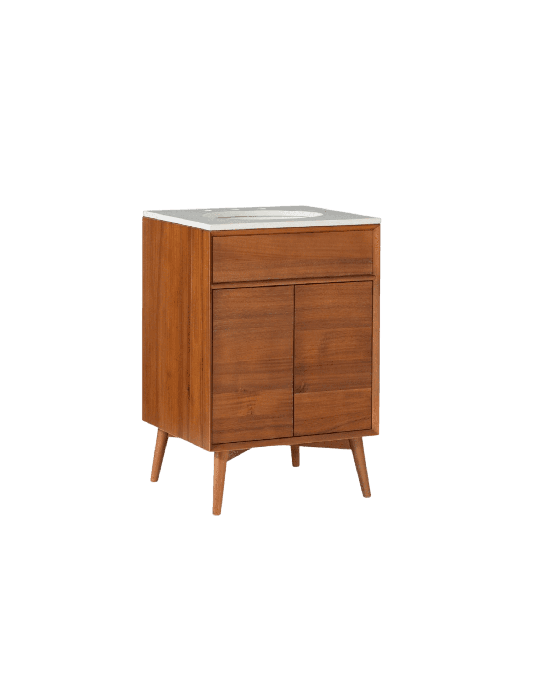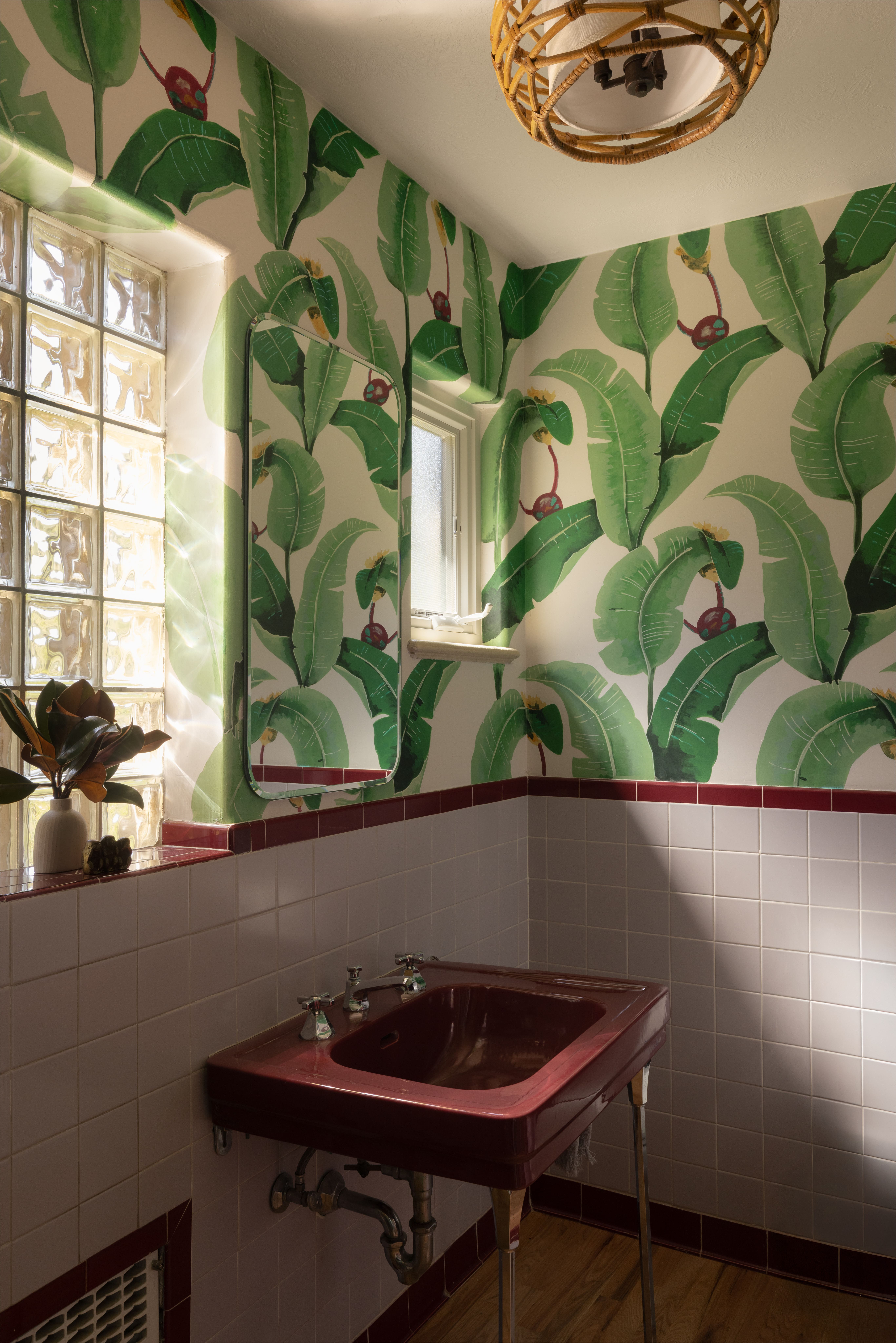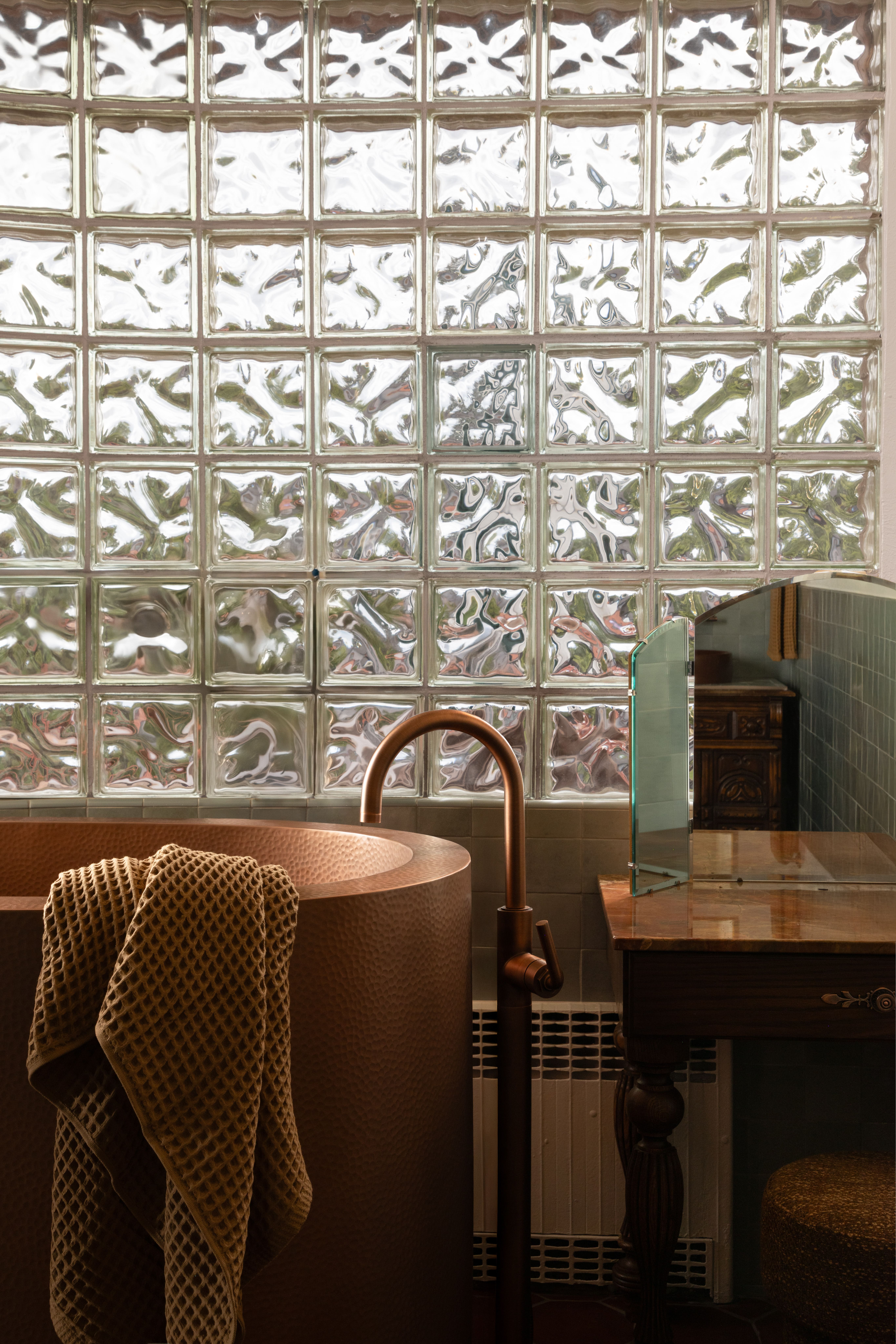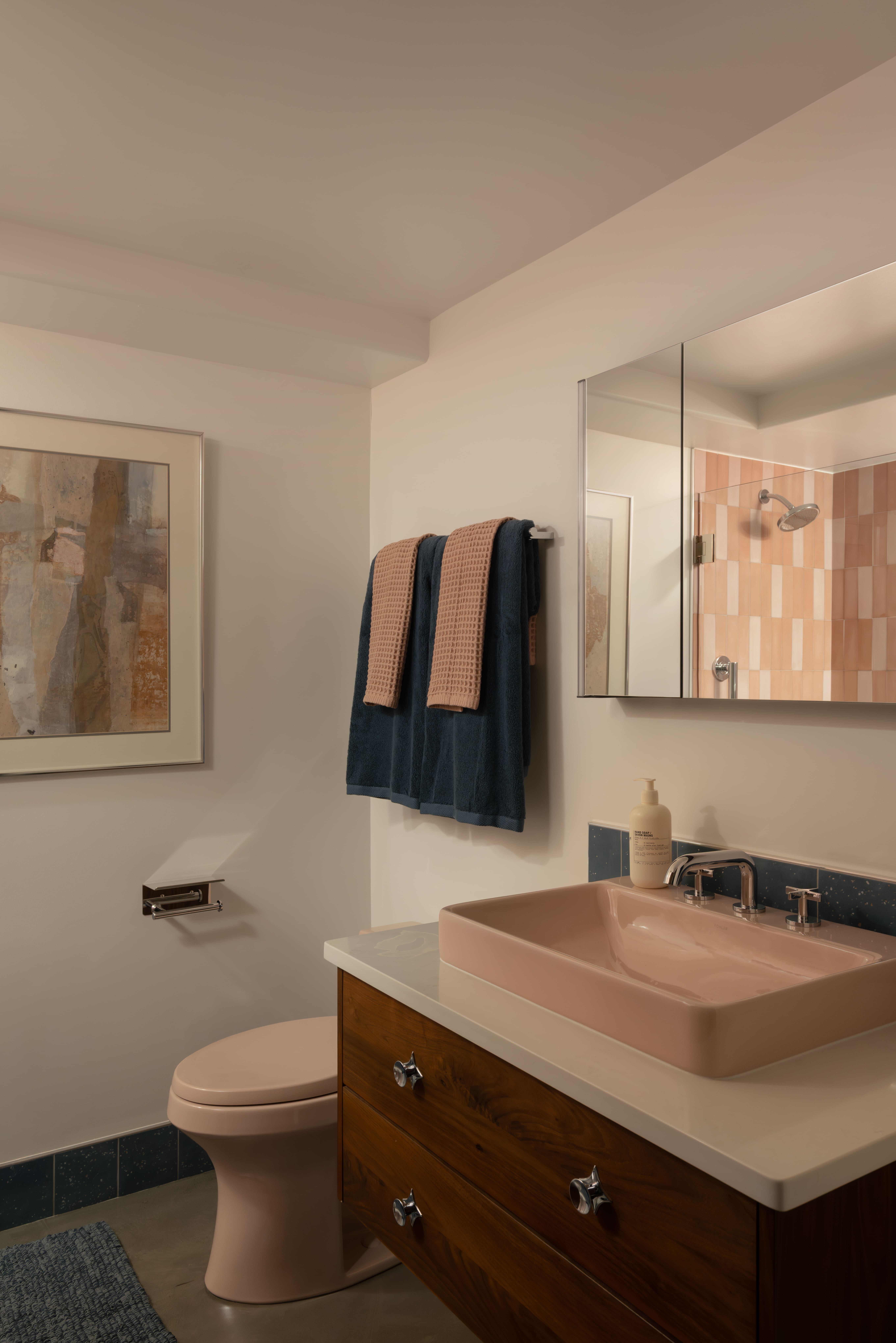 In the green bathroom, mid-century influences come through in a more direct way, with furnishings and storage pieces that nod to the era while still feeling fresh in context. Like the rest of the home, the room walks that line between old and new, character and clarity.