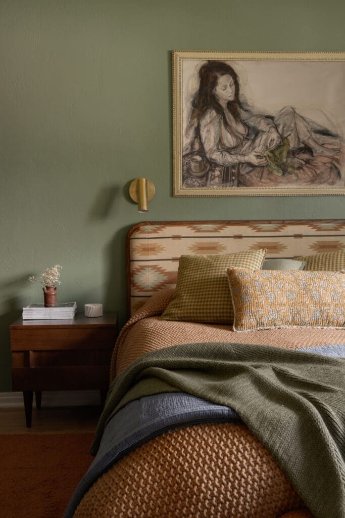 The primary suite shifts into a moodier palette, offering a slightly more intimate side of the home. Benjamin Moore’s Land of Liberty was used in the bedroom, creating a grounded backdrop that feels rich without overwhelming the space. Elsewhere, Mistletoe was used throughout the house, helping create continuity from room to room.