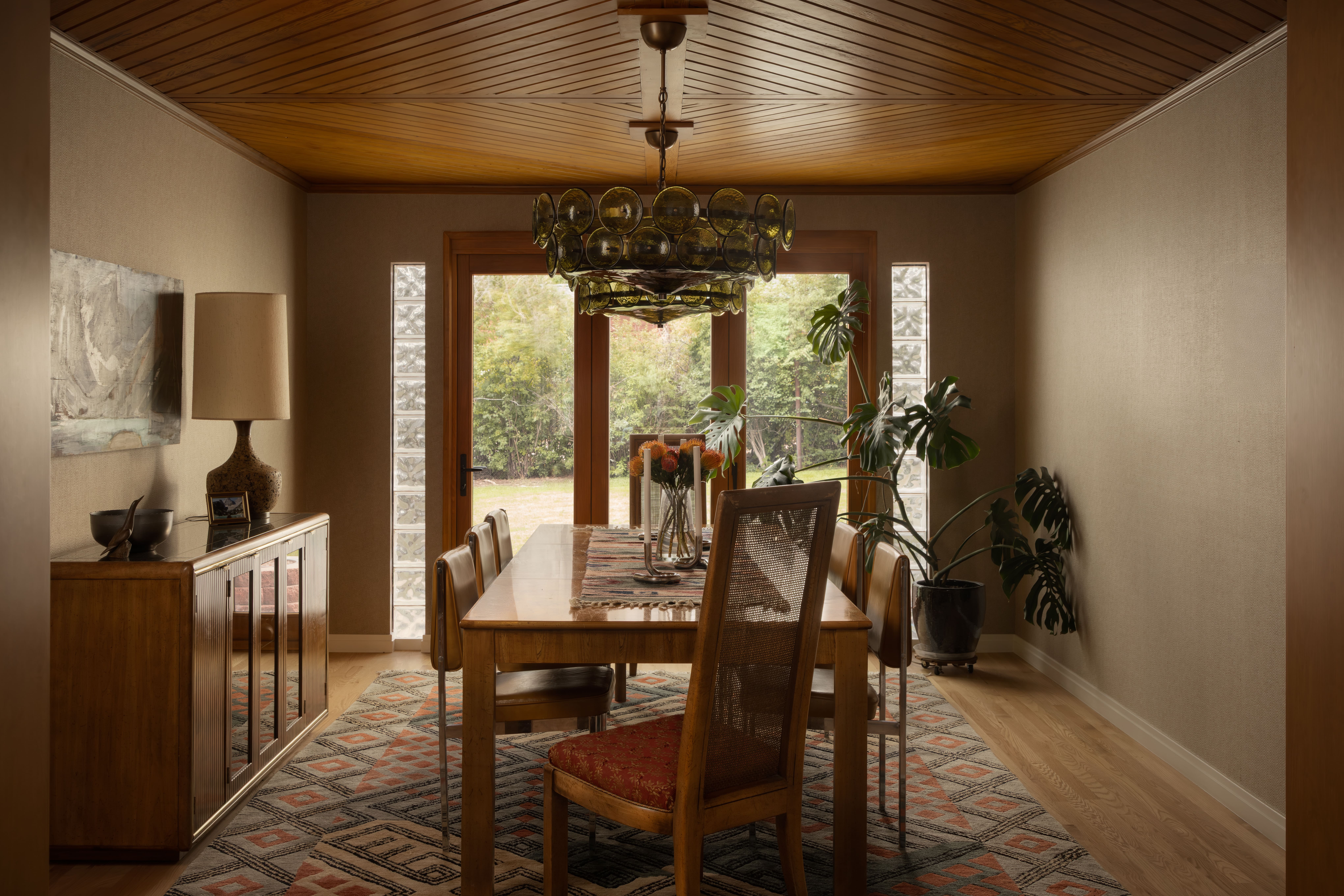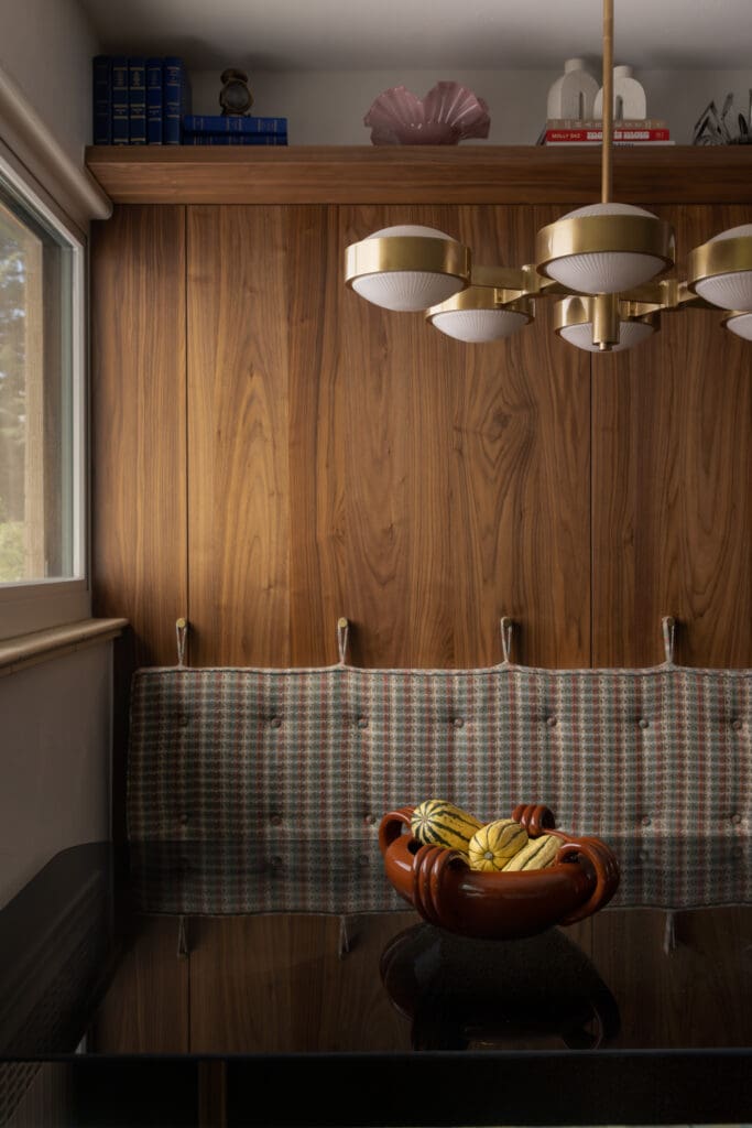 If the kitchen is about structure, the breakfast nook brings in some of the personality that makes the house memorable. This is where the layered styling starts to tell more of the homeowners’ story. The space feels intimate and relaxed, with a mix of forms and finishes that add warmth without losing the mid-century thread running through the home.