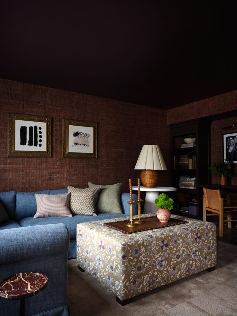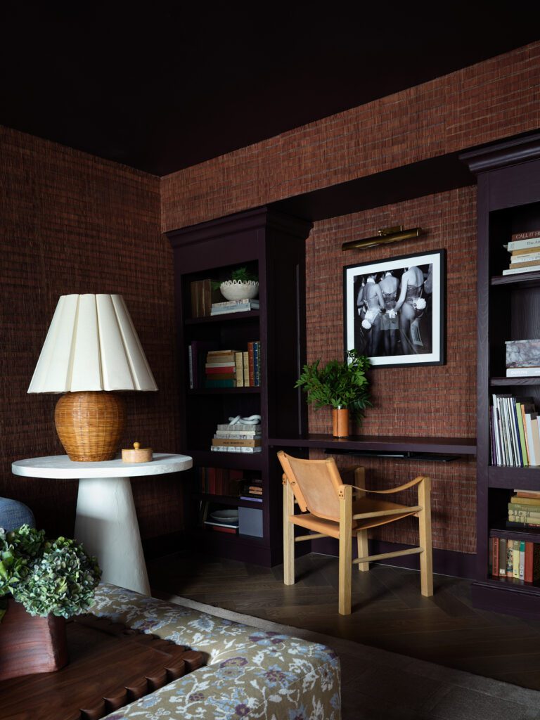 Since the very first days of the Tudor Home, the Snug has been our family’s favorite lounge spot. We took this space from an awkward primary bedroom to a workspace for Quinn that would double as an entertaining space, and it’s evolved even more since Kamryn’s arrival. We kept the heart of the room the same — grounded by beautiful woven grass from Elitis France wallpaper and millwork painted Benjamin Moore’s Caponata, and added in a few cozier elements.