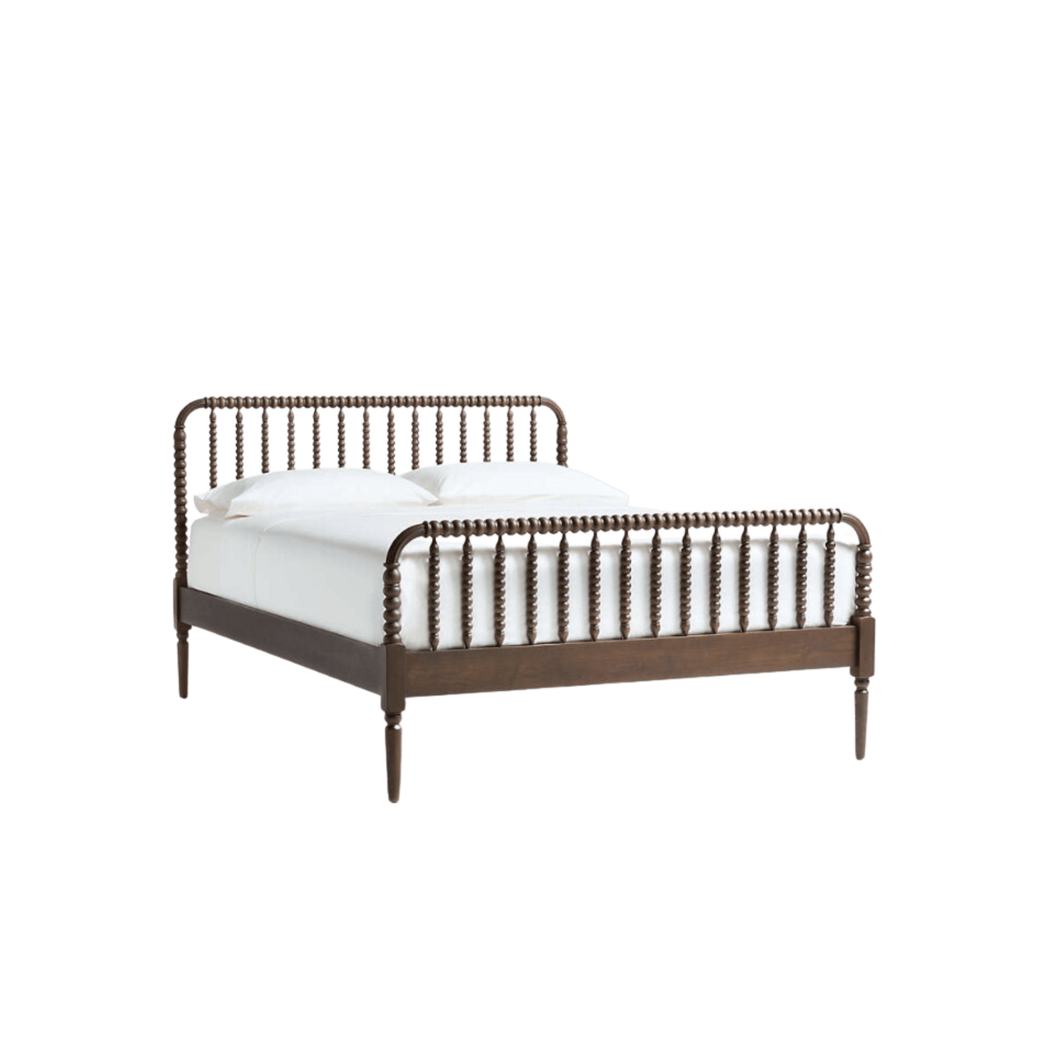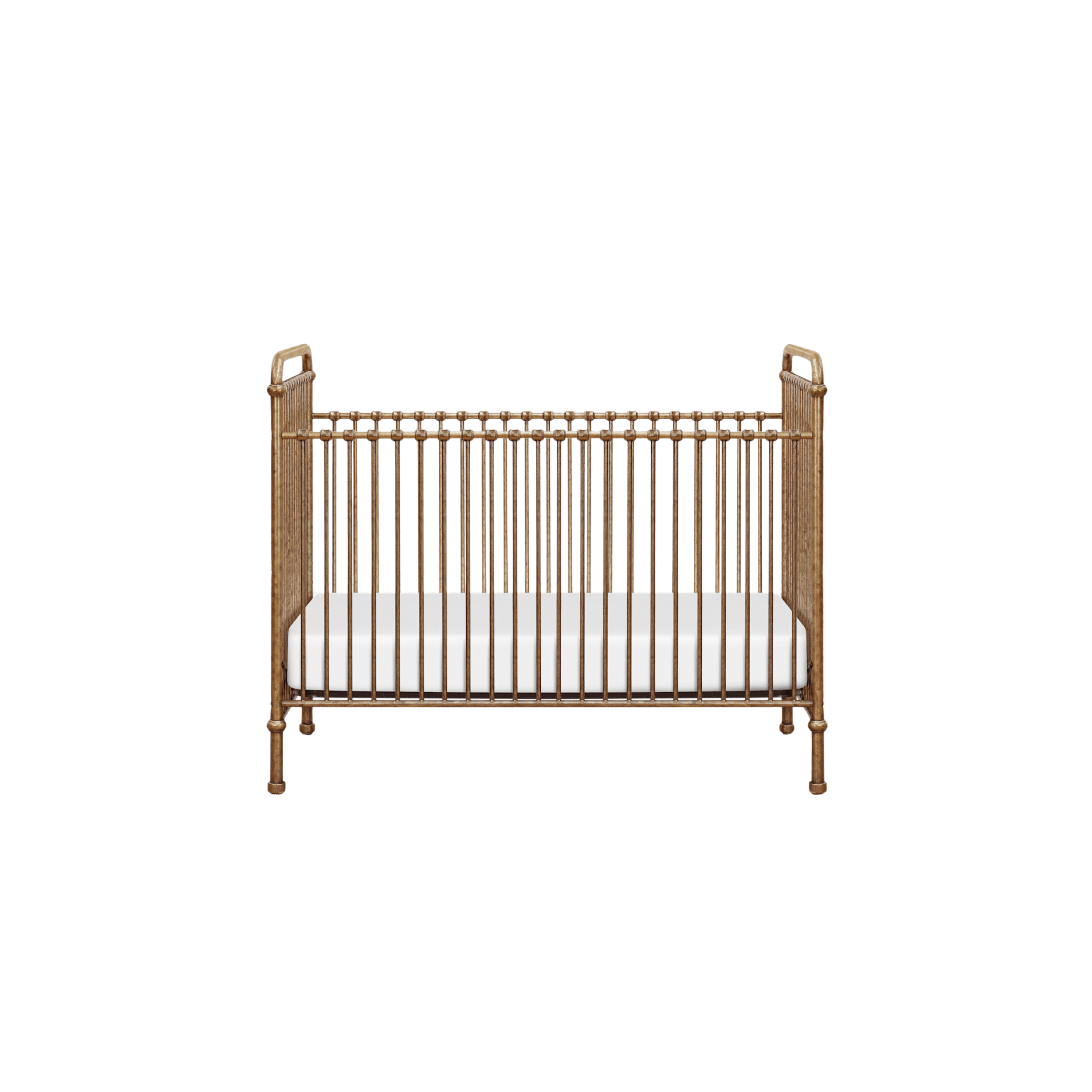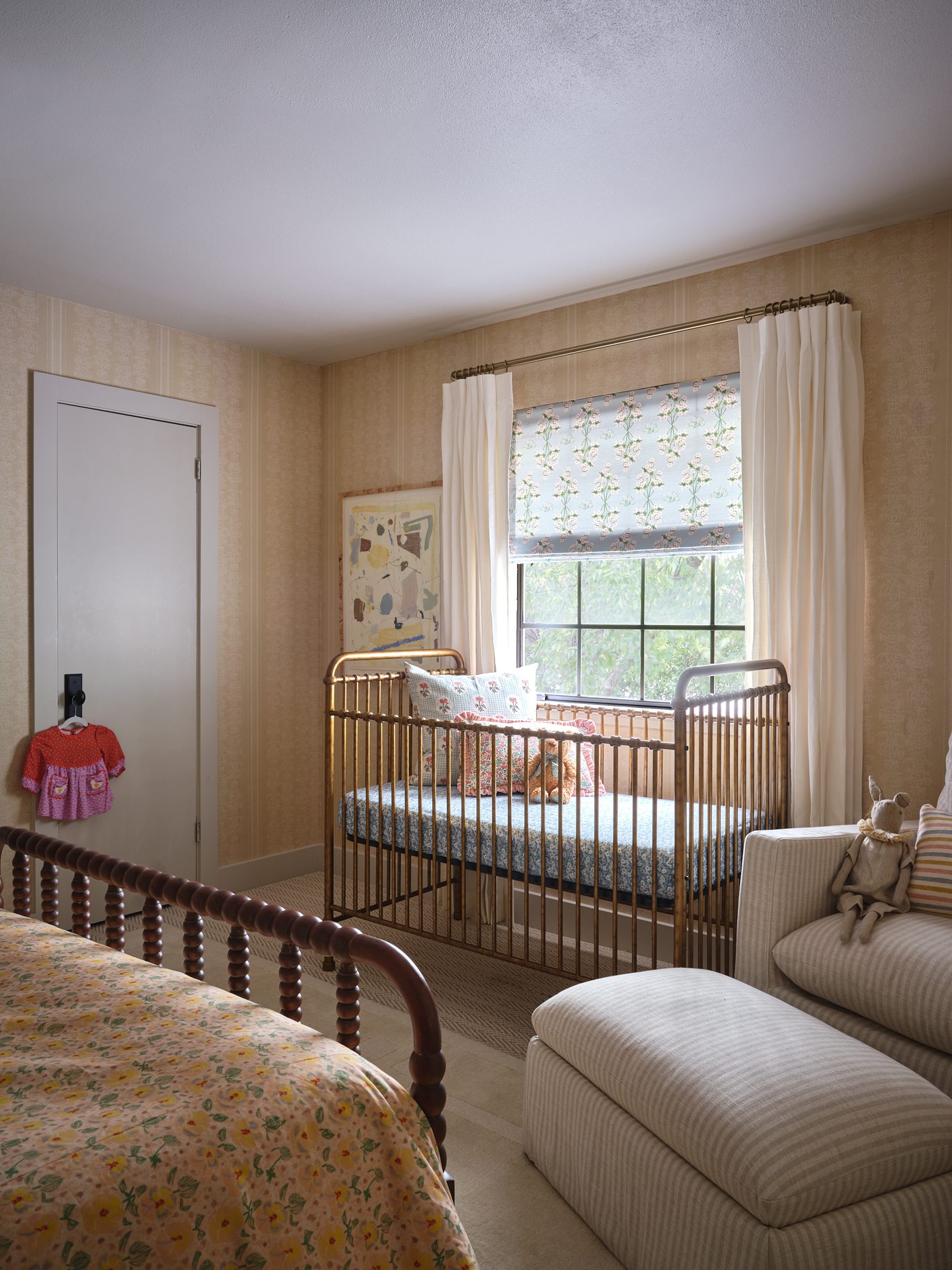 When planning for the nursery design, we knew we’d start with the existing finishes of the yellow bedroom in our home. As the open bedroom with the best space and storage, it made the most sense for Kamryn to grow into. The room’s existing yellow wallpaper served as a pretty, gender-neutral foundation and a great jumping-off point. We left the queen-size Jenny Lind bed for guests when needed and added a matching hand-me-down brass crib gifted to us by our friends.
