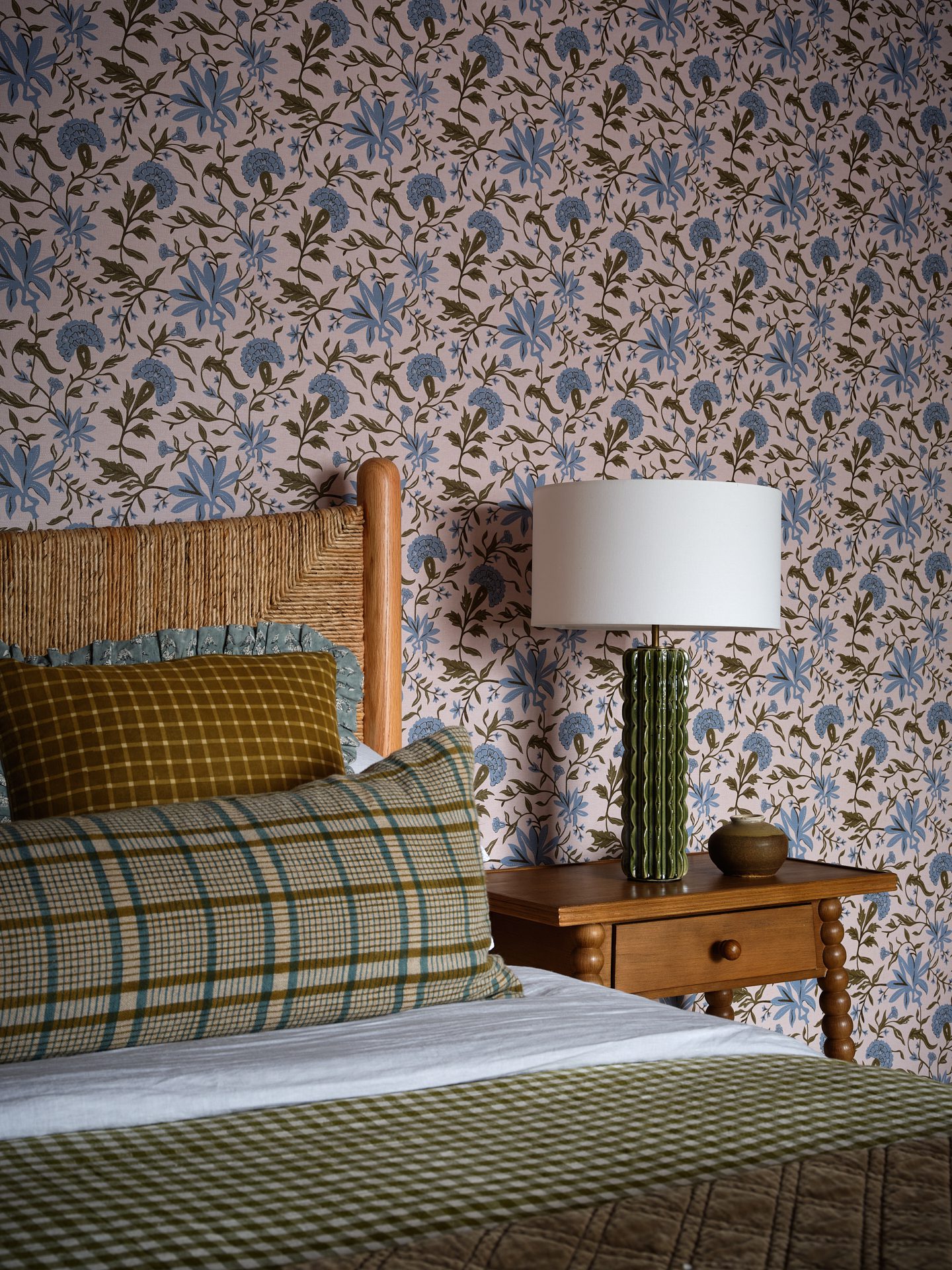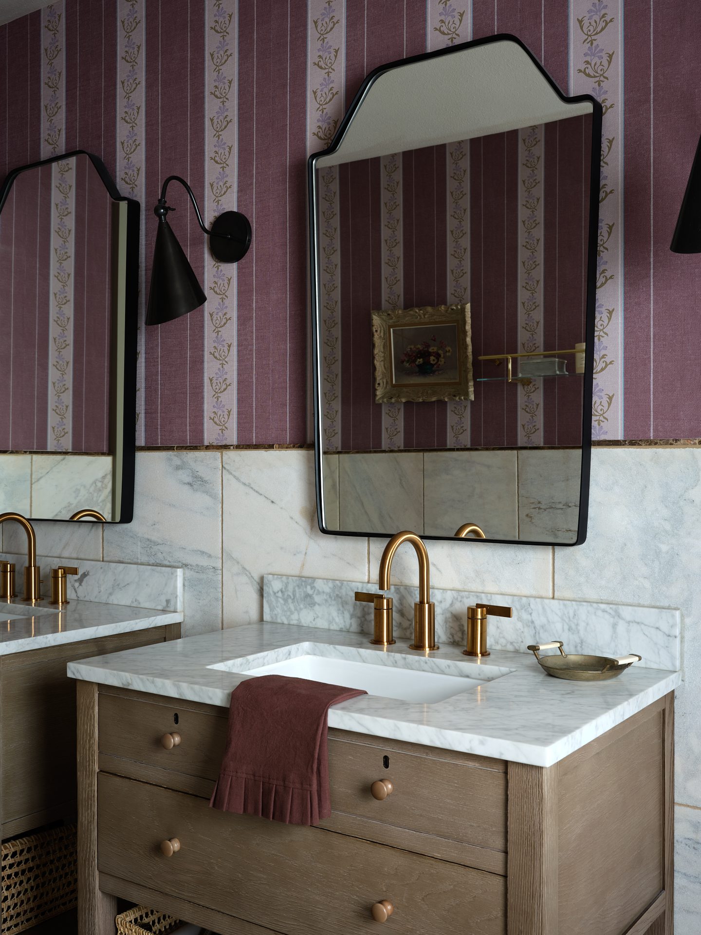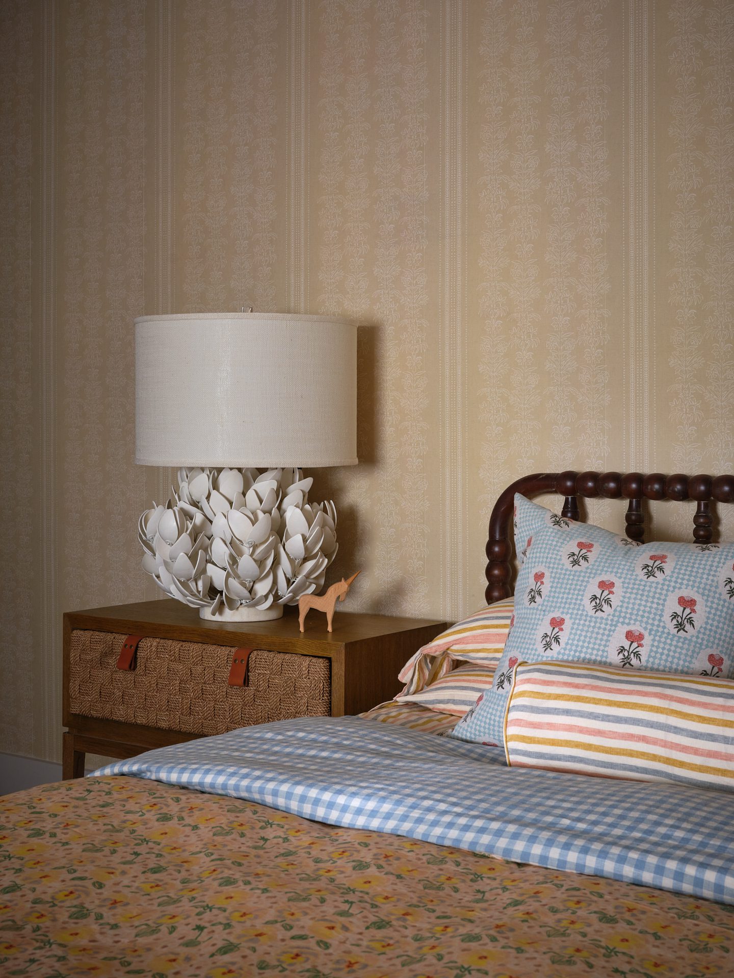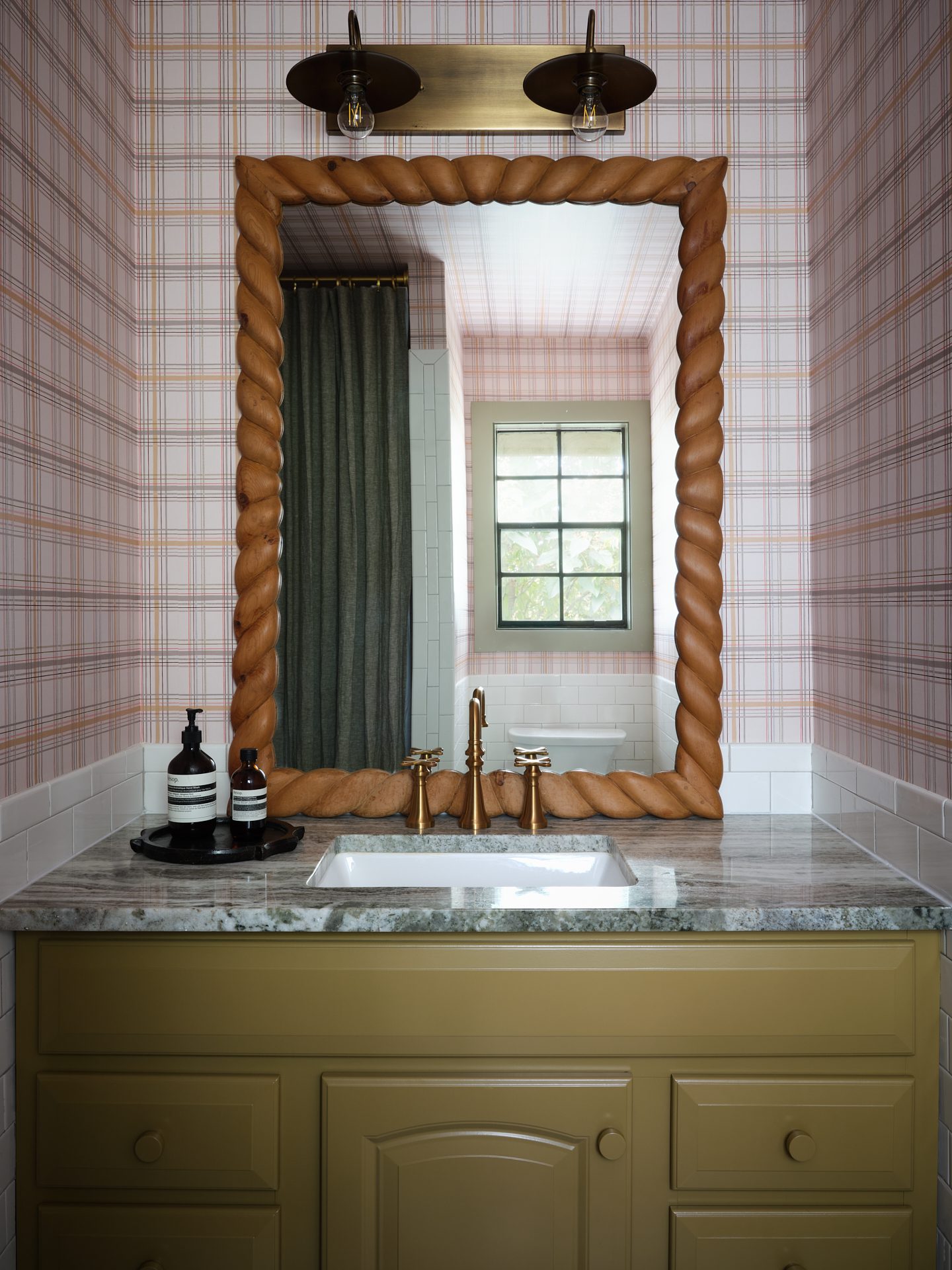 One of the best parts about our wallpaper collaboration with Chasing Paper has been adding the pieces to our home. We designed so much of this collection with historic homes like the Tudor in mind, so the selections feel like a natural fit in our spaces. Bringing the Posey Stipe wallpaper into our bathroom introduced the perfect dose of color and fun while keeping with the original design’s timeless feeling. In the primary bedroom, we couldn’t help but add Vintage Plaid to the ceiling, and we love how it draws the eye up and creates so much depth in the room.