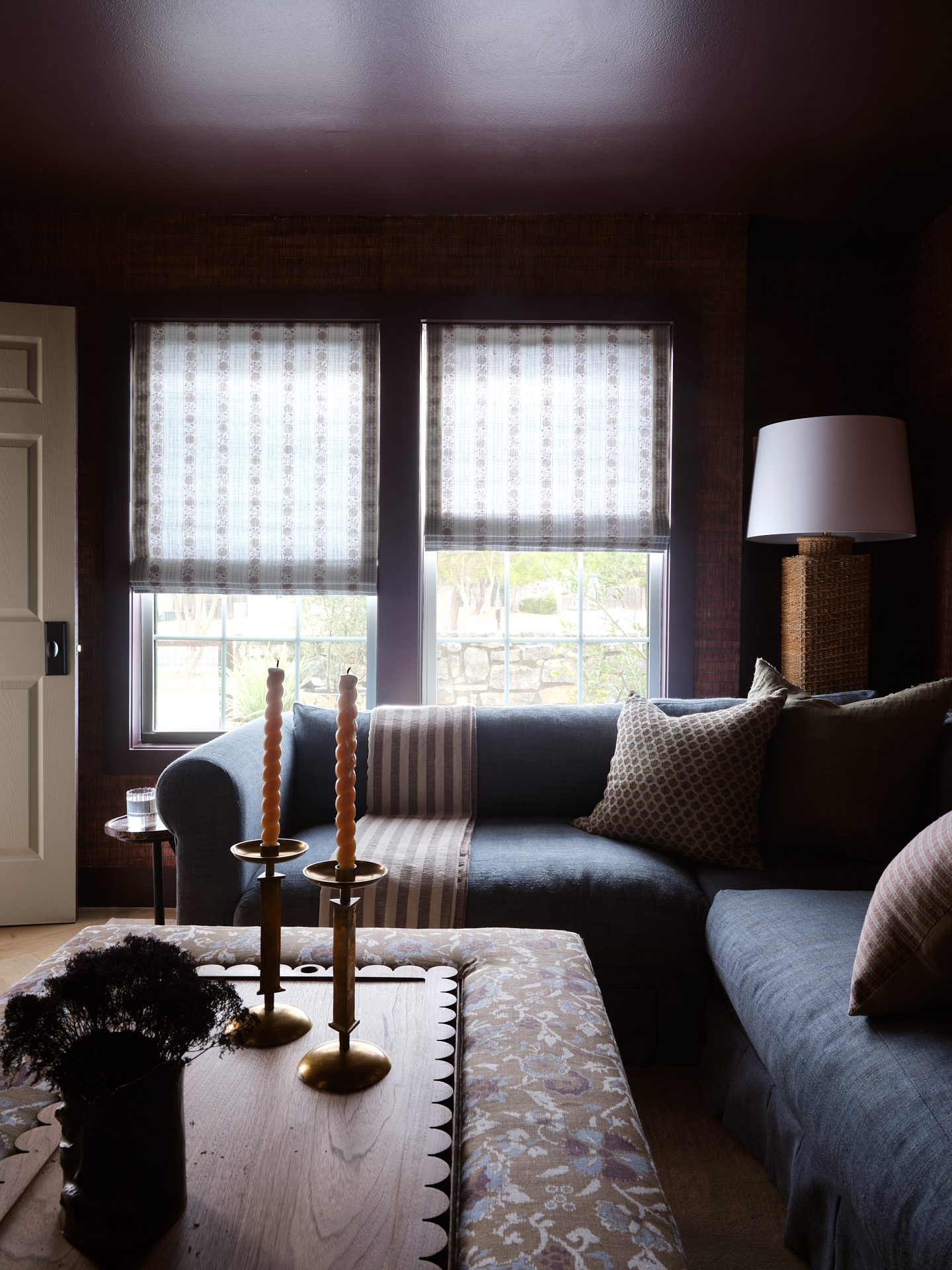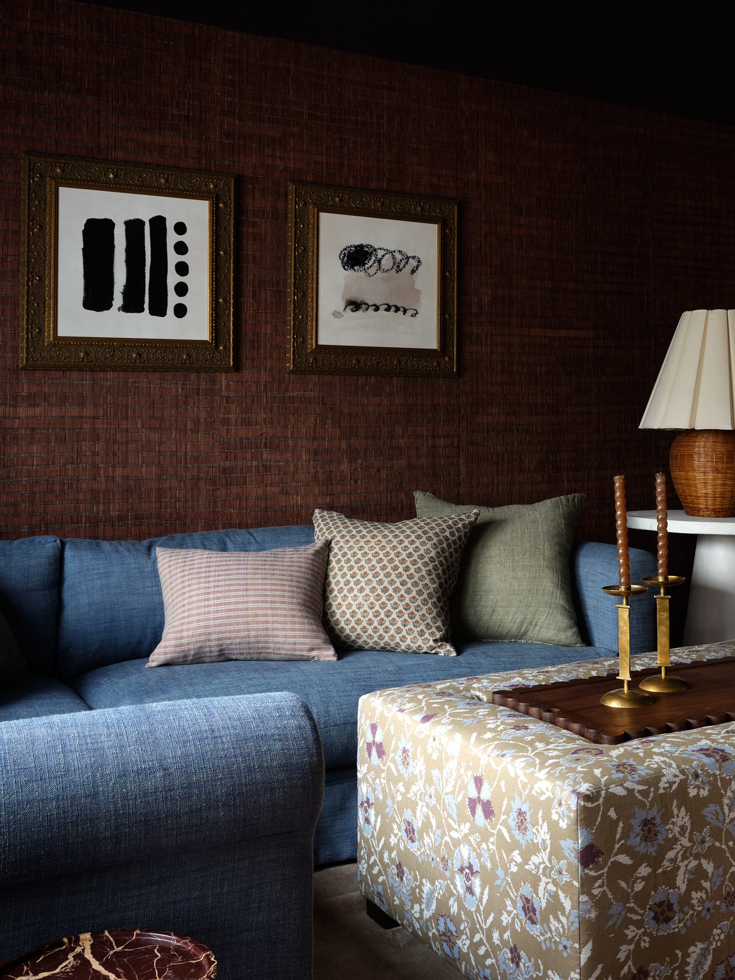 Since the very first days of the Tudor Home, the Snug has been our family’s favorite lounge spot. We took this space from an awkward primary bedroom to a workspace for Quinn that would double as an entertaining space, and it’s evolved even more since Kamryn’s arrival. We kept the heart of the room the same — grounded by beautiful woven grass from Elitis France wallpaper and millwork painted Benjamin Moore’s Caponata, and added in a few cozier elements.