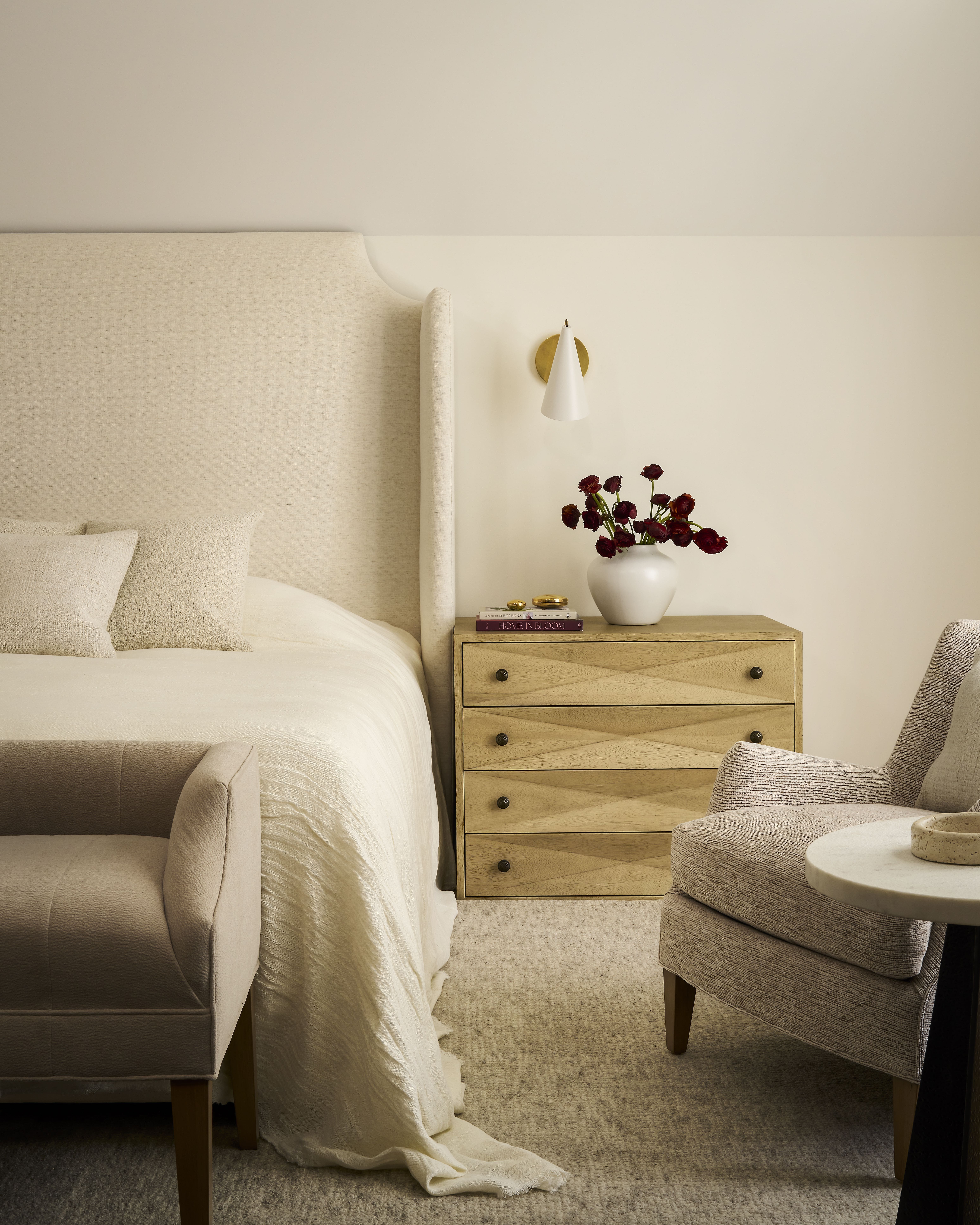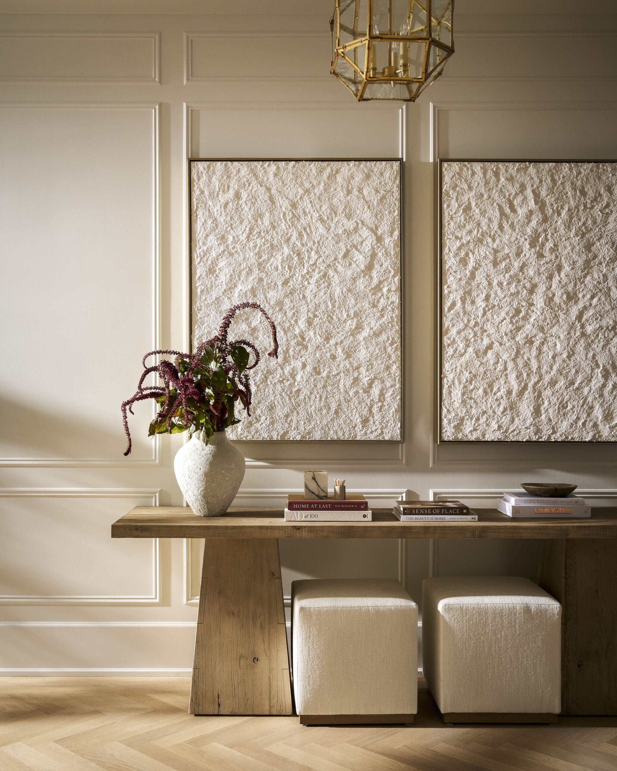 Every material was chosen with intention. Performance fabrics ensure the spaces hold up to everyday use, while finishes were selected to age gracefully over time. Linen textures, light woods, and tactile artwork, like the Chasm Print I from Jayson Home, bring softness and depth.
